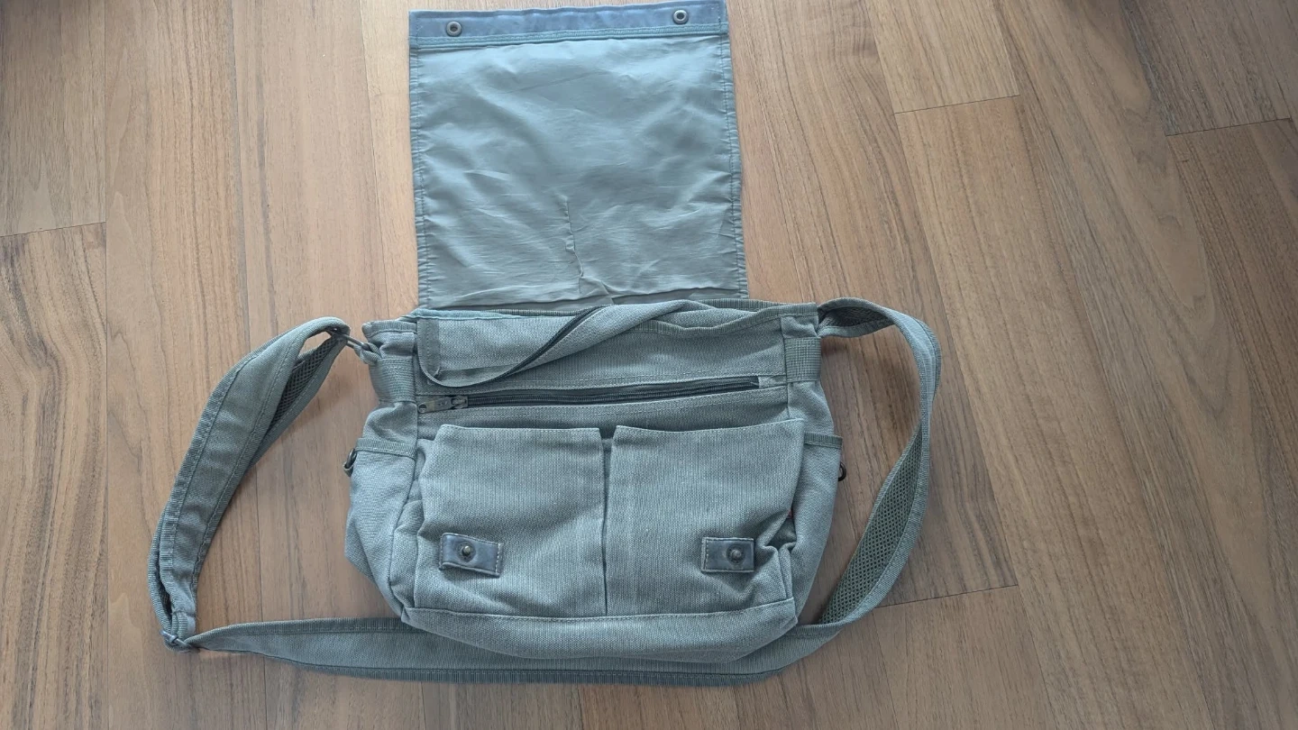 Canvas messenger bag by Diesel. It has a zip-top closure with a flap. Multiple pockets inside and out for organization. Adjustable shoulder strap.