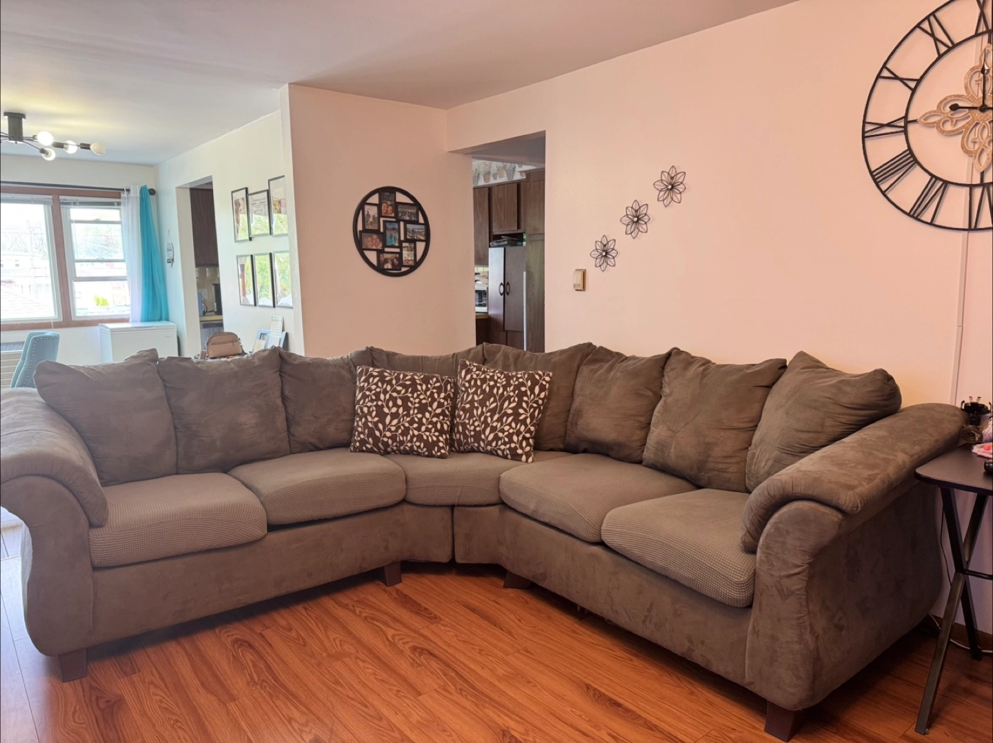 Spacious corner sectional. Gray microfiber upholstery. Includes throw pillows. Good for a large living room.