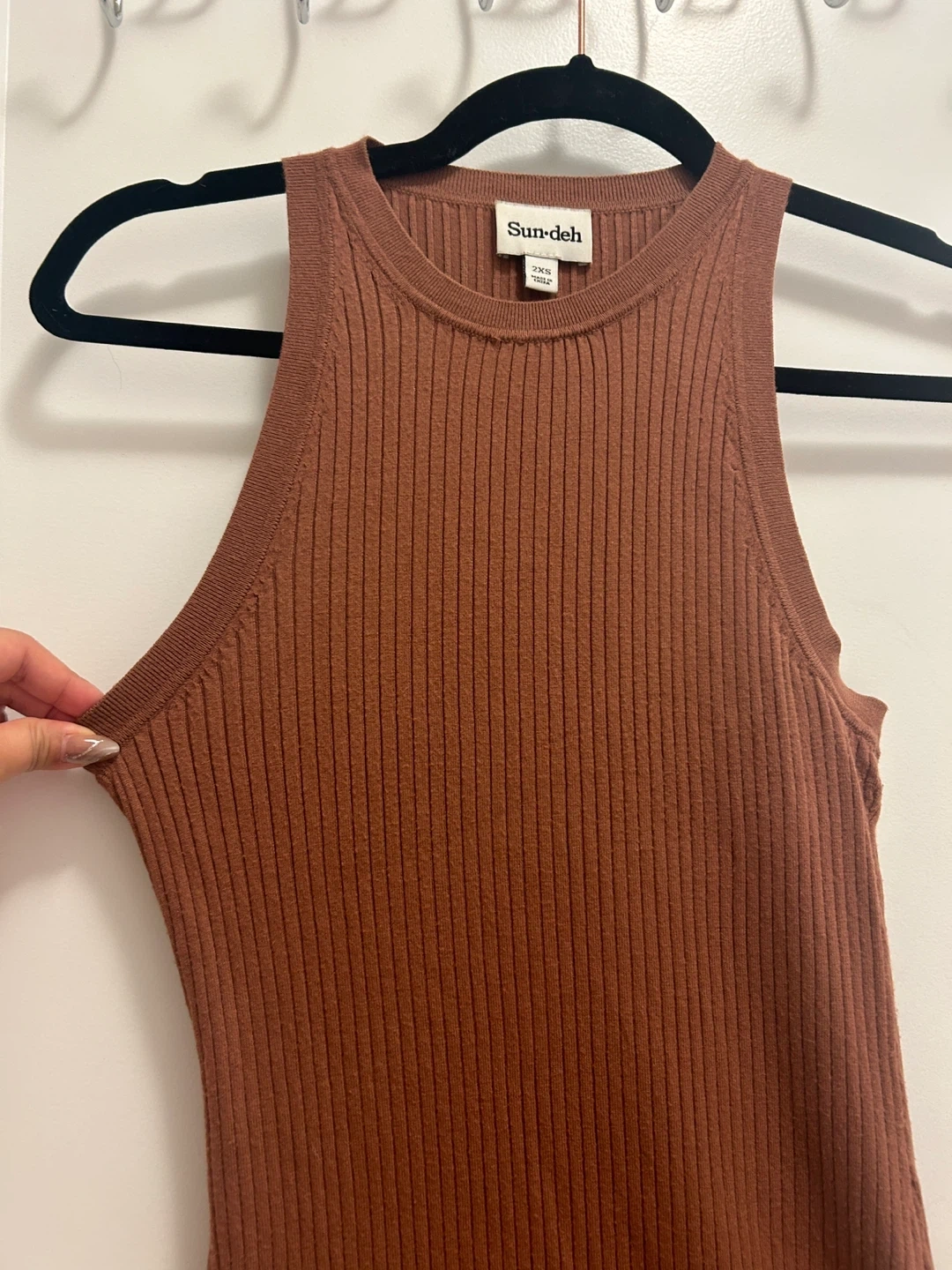Sun-deh ribbed knit dress in a warm brown hue. Sleeveless design with a racerback cut. Made from a stretchy knit material. *it shows 2xs, but it fits me, I normally wears S/M*