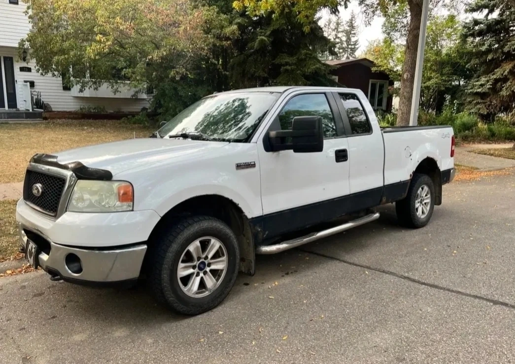 Selling a 2008 Ford F-150 truck with 305k on it. It's white with black trim along the bottom. Has running boards and 4x4.