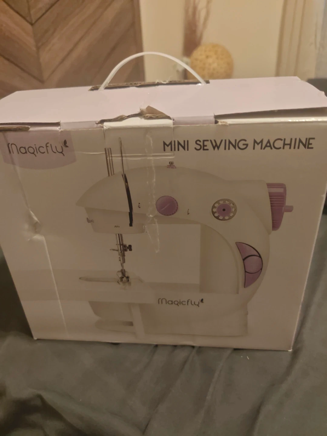 This Magicfly mini sewing machine is designed for beginners. It's portable and comes with an extension table and a sewing kit. Includes various thread colours and accessories. New in box