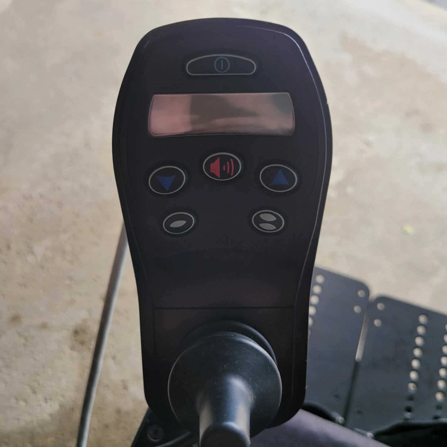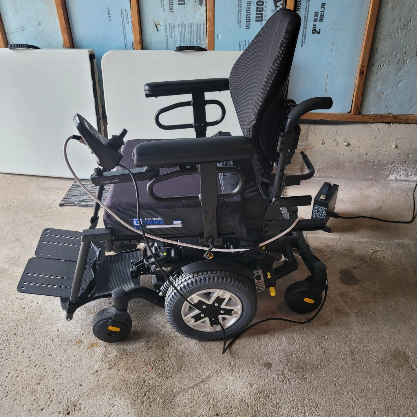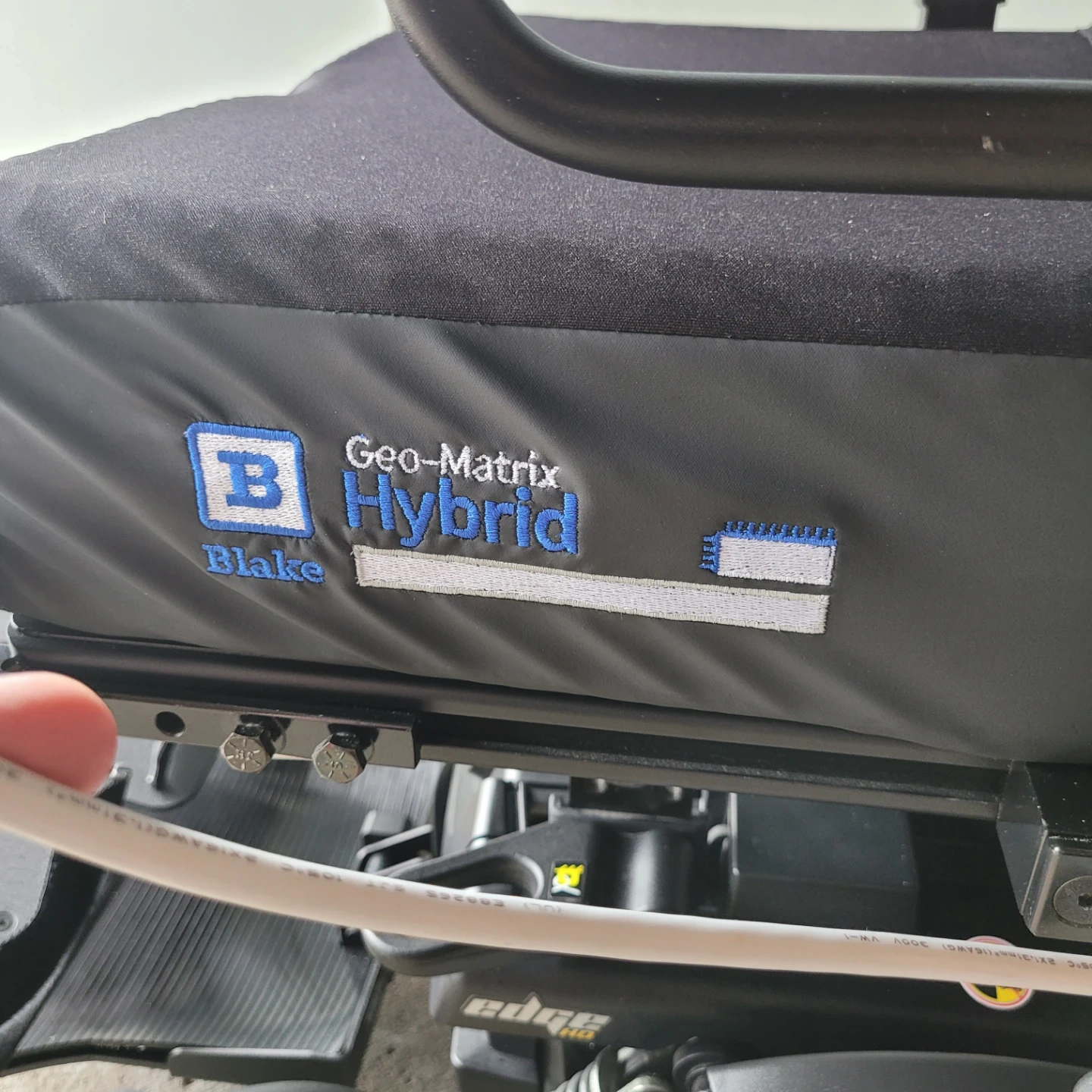 This is a Pride Mobility Edge 3 HD power wheelchair. It features Geo-Matrix Hybrid seating. This chair is designed for robust performance and comfort.
