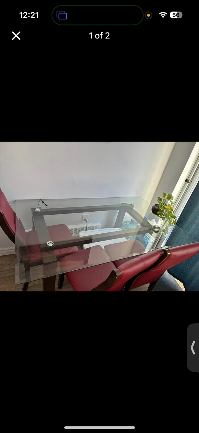 A stylish dining table featuring a clear glass top and a sturdy dark wood frame. It's perfect for everyday meals and entertaining guests. This table has a modern design that fits most dining spaces.