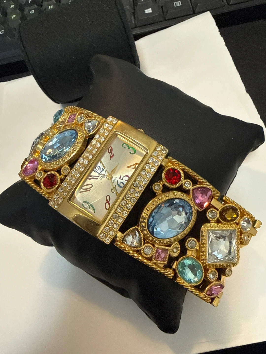 This H&W watch features a gold-tone band encrusted with colorful faux gemstones and clear crystals. It has a rectangular face with a light-coloured dial and Roman numerals. A unique statement piece for any occasion!
