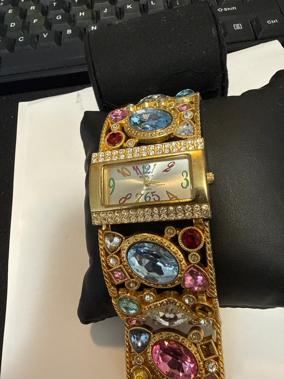 This H&W watch features a gold-tone band encrusted with colorful faux gemstones and clear crystals. It has a rectangular face with a light-coloured dial and Roman numerals. A unique statement piece for any occasion!