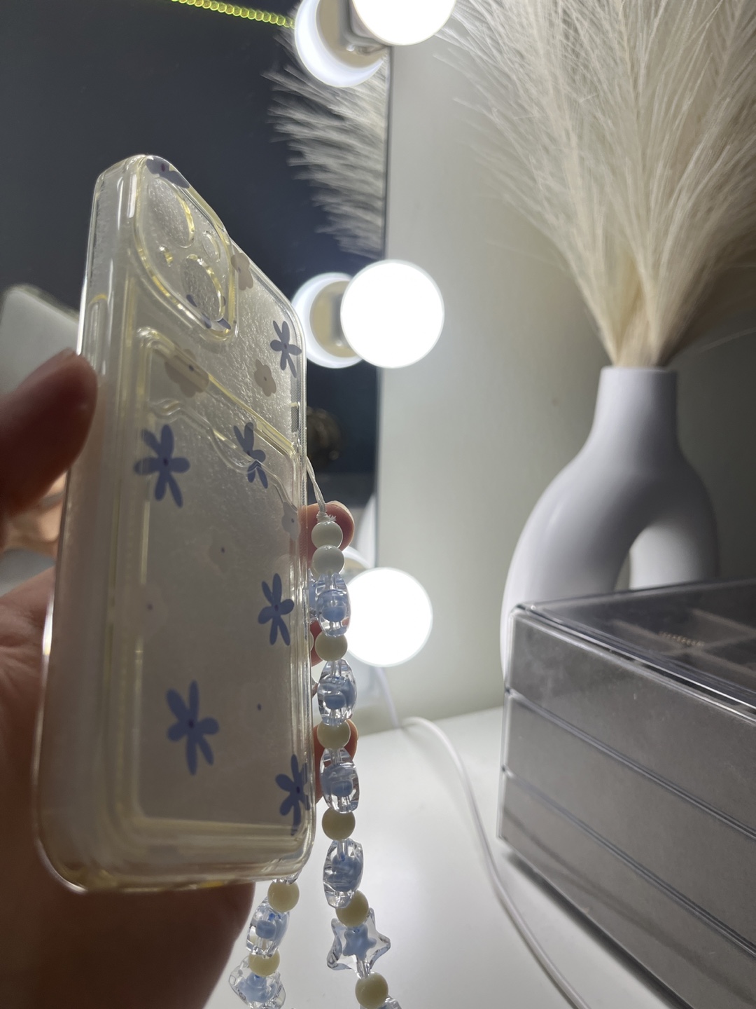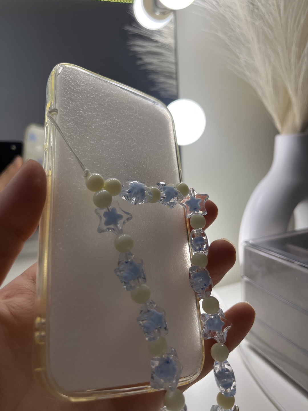Selling a cute iPhone case with a beaded strap! The case is clear with a floral design, and the strap has star-shaped beads. It's in great condition and ready for a new home!
