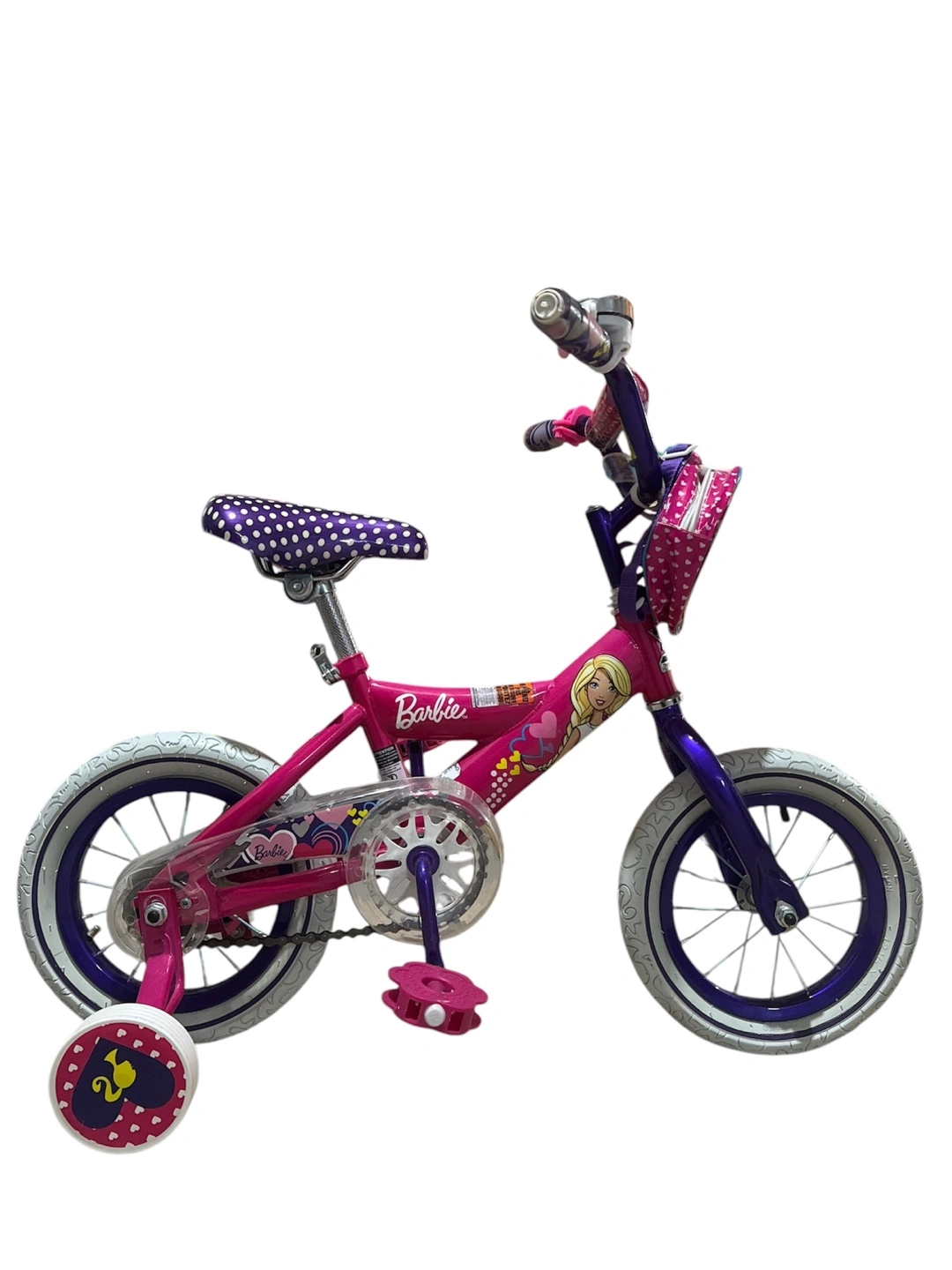 Pink and purple children's bicycle. Features training wheels, a Barbie-themed design, and a small storage bag. Great for young riders.
