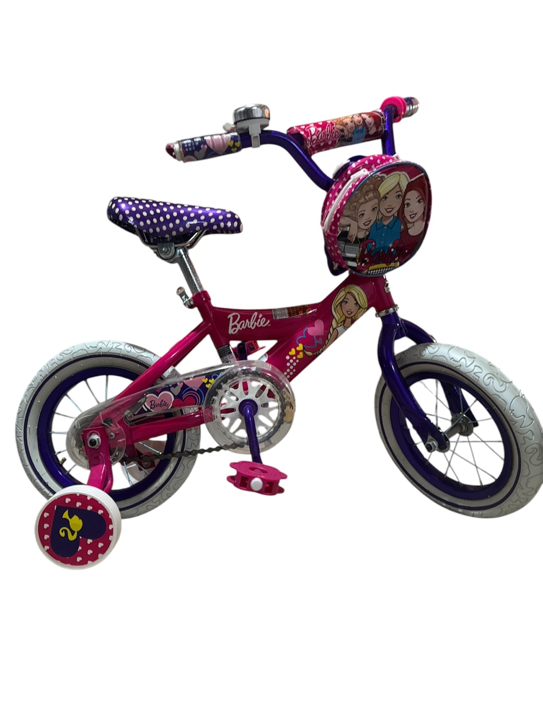 Pink and purple children's bicycle. Features training wheels, a Barbie-themed design, and a small storage bag. Great for young riders.