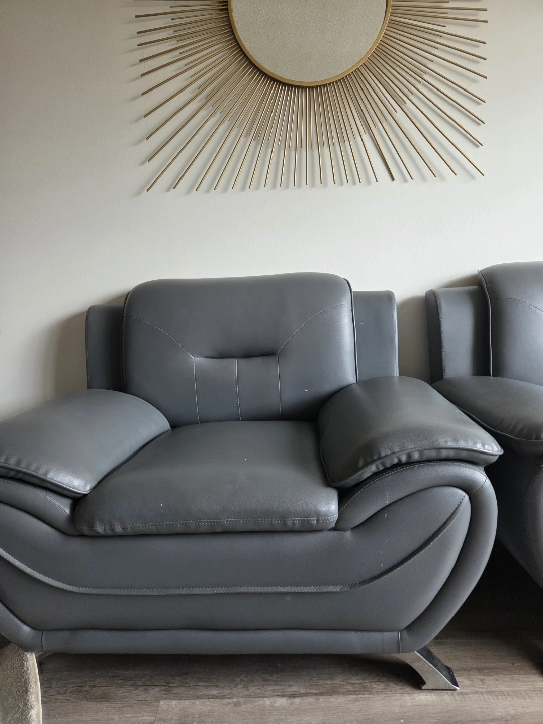 Two grey faux leather seating pieces for your living room. Includes a loveseat and a matching armchair. Modern curved design with padded armrests.