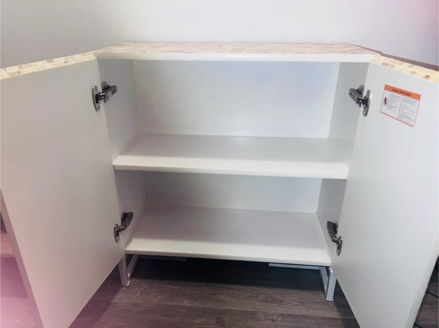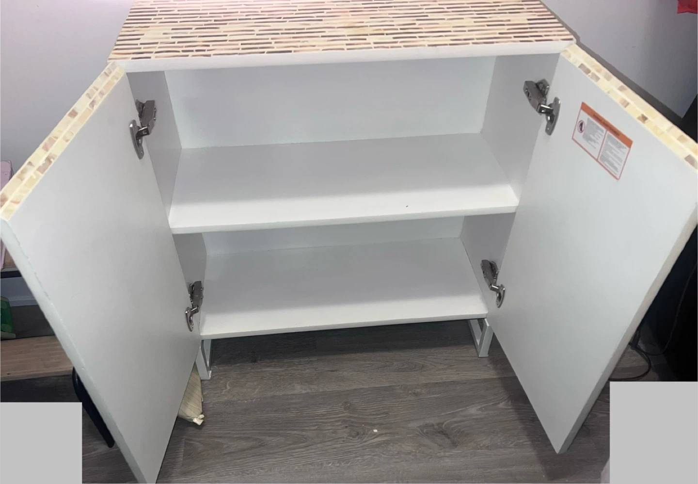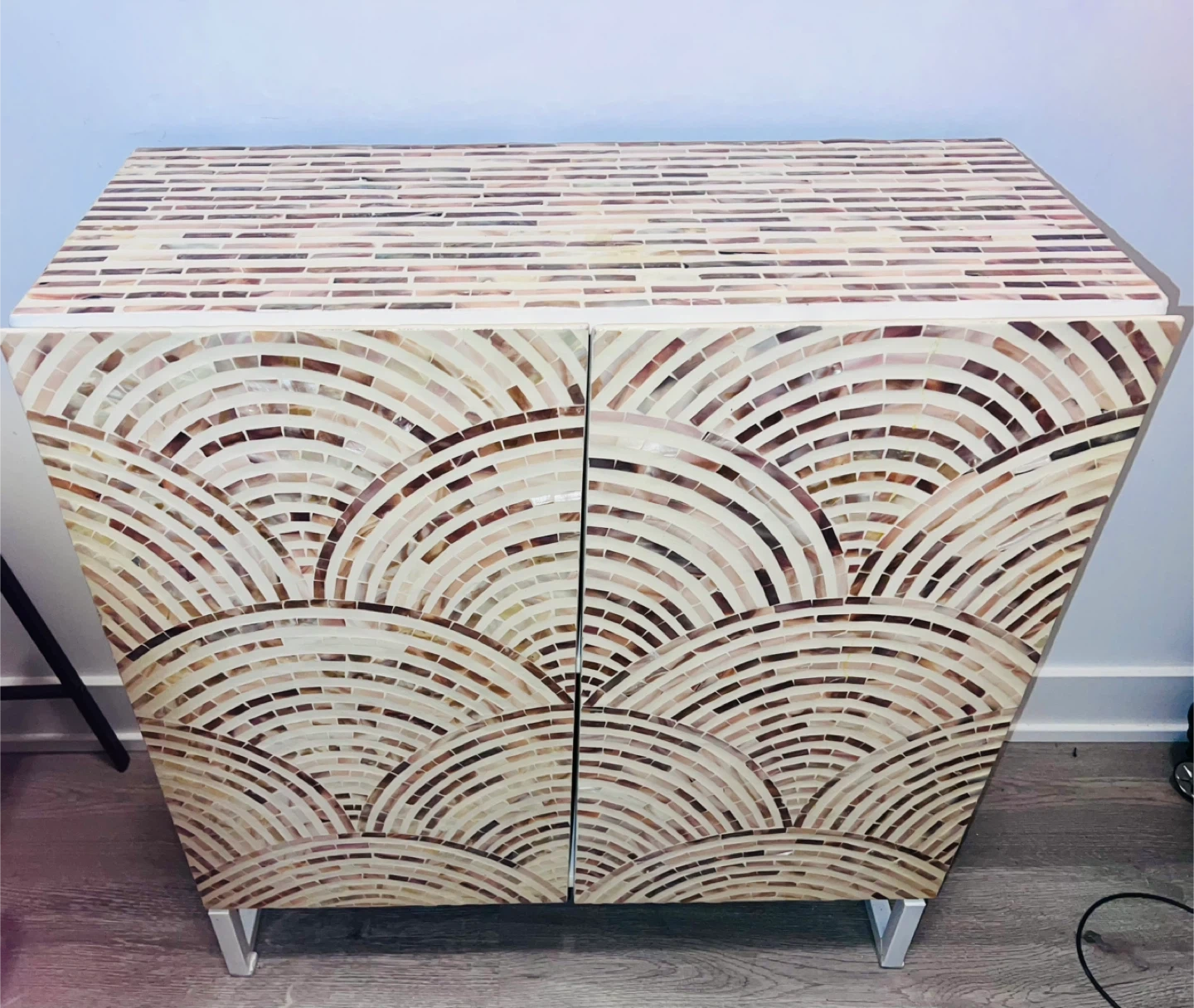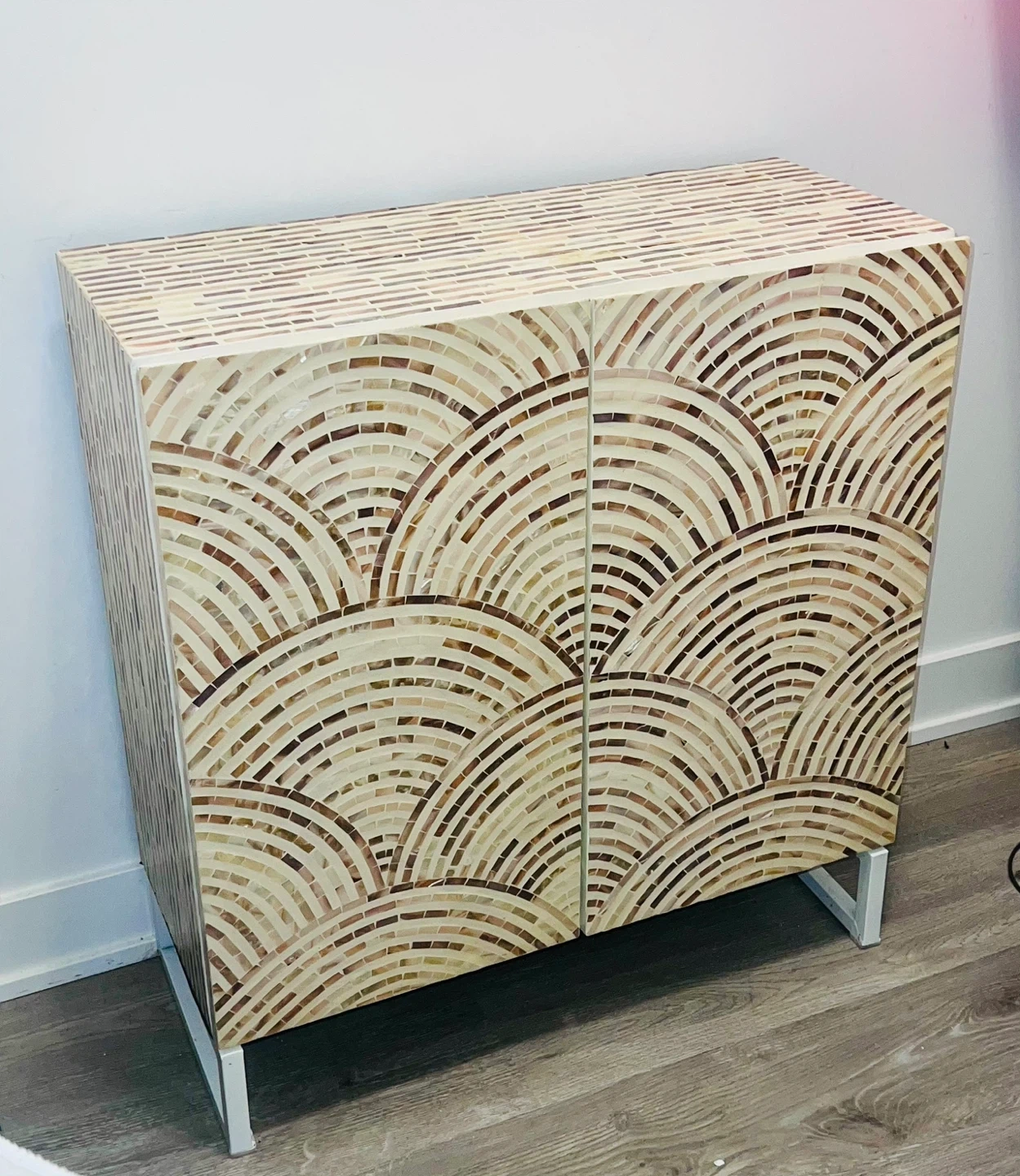 Selling a cabinet with a beautiful mosaic tile design. It has two doors and interior shelving for storage. The cabinet is in good condition and would look great in any room!
