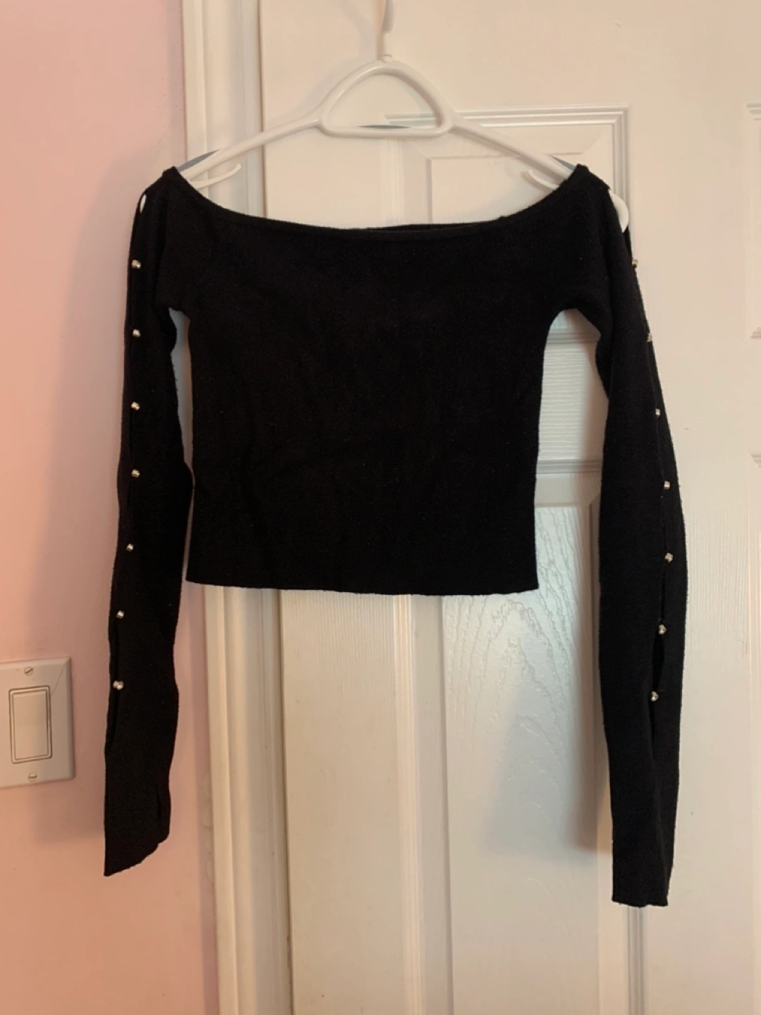 Selling a cute Cider off-shoulder top in black! It's a size small and features long sleeves with button detailing. Perfect for a night out or a casual day!