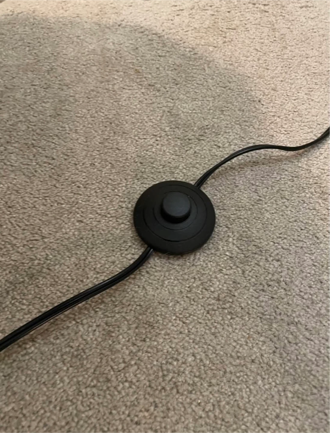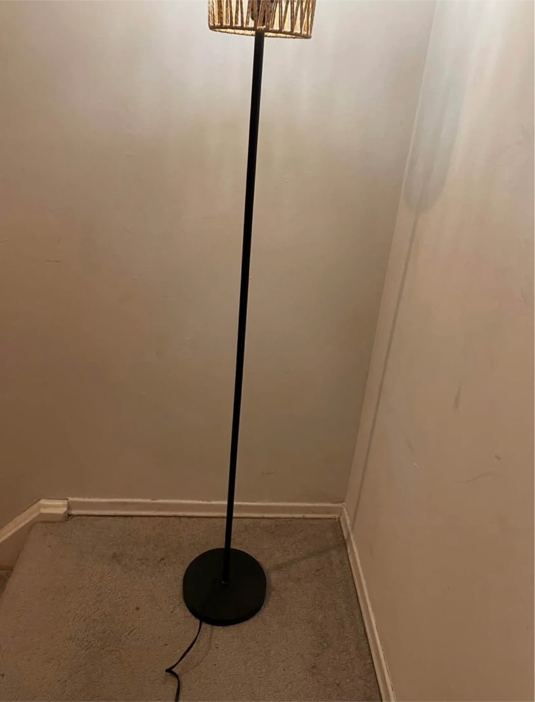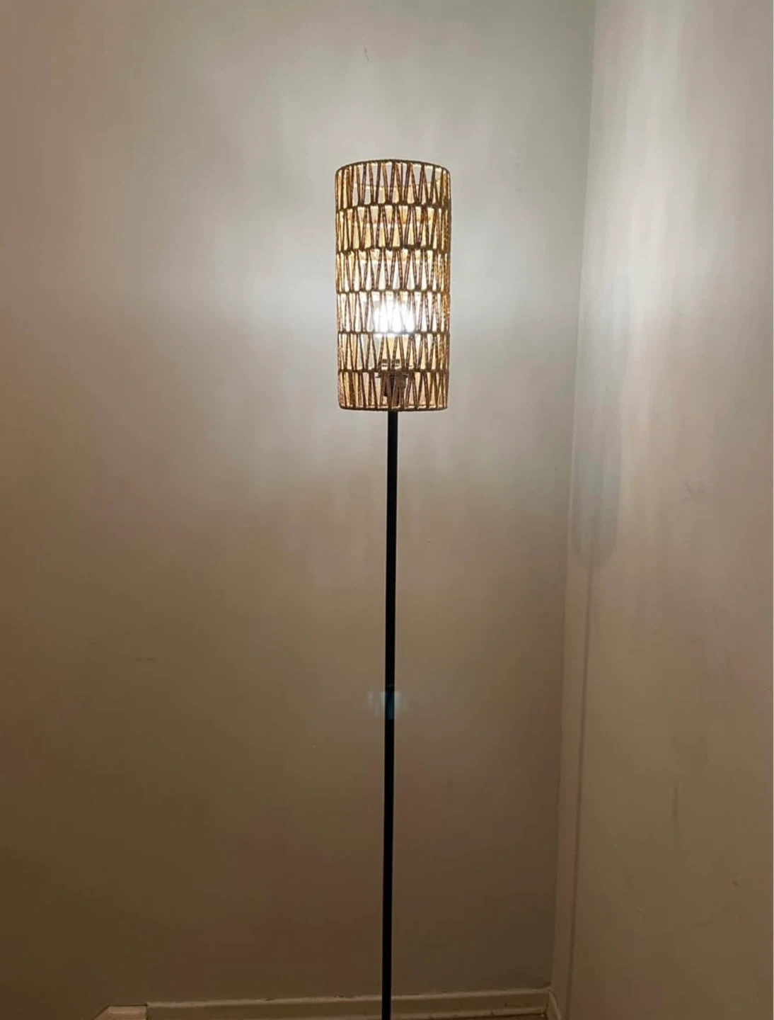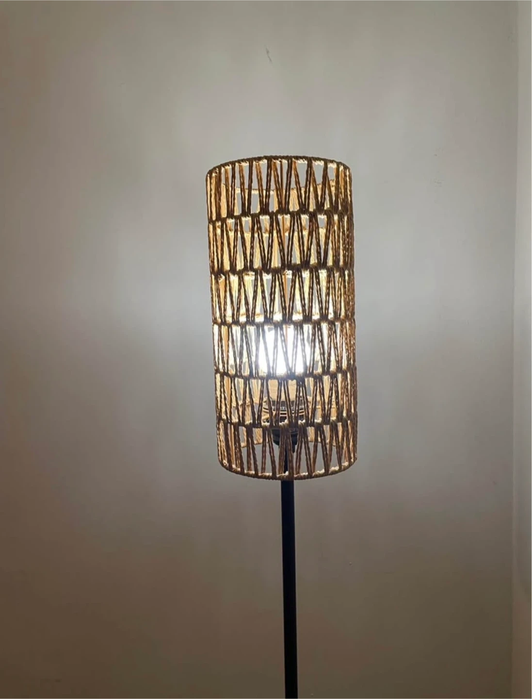 Brand new boho standing lamp with 3 colour temperatures LED Bulb (warm, neutral, cool) - This floor lamp features a drum-shaped shade with a woven texture. It has a black metal pole and a round base with a foot switch for easy operation. Adds a warm, ambient glow to any room.