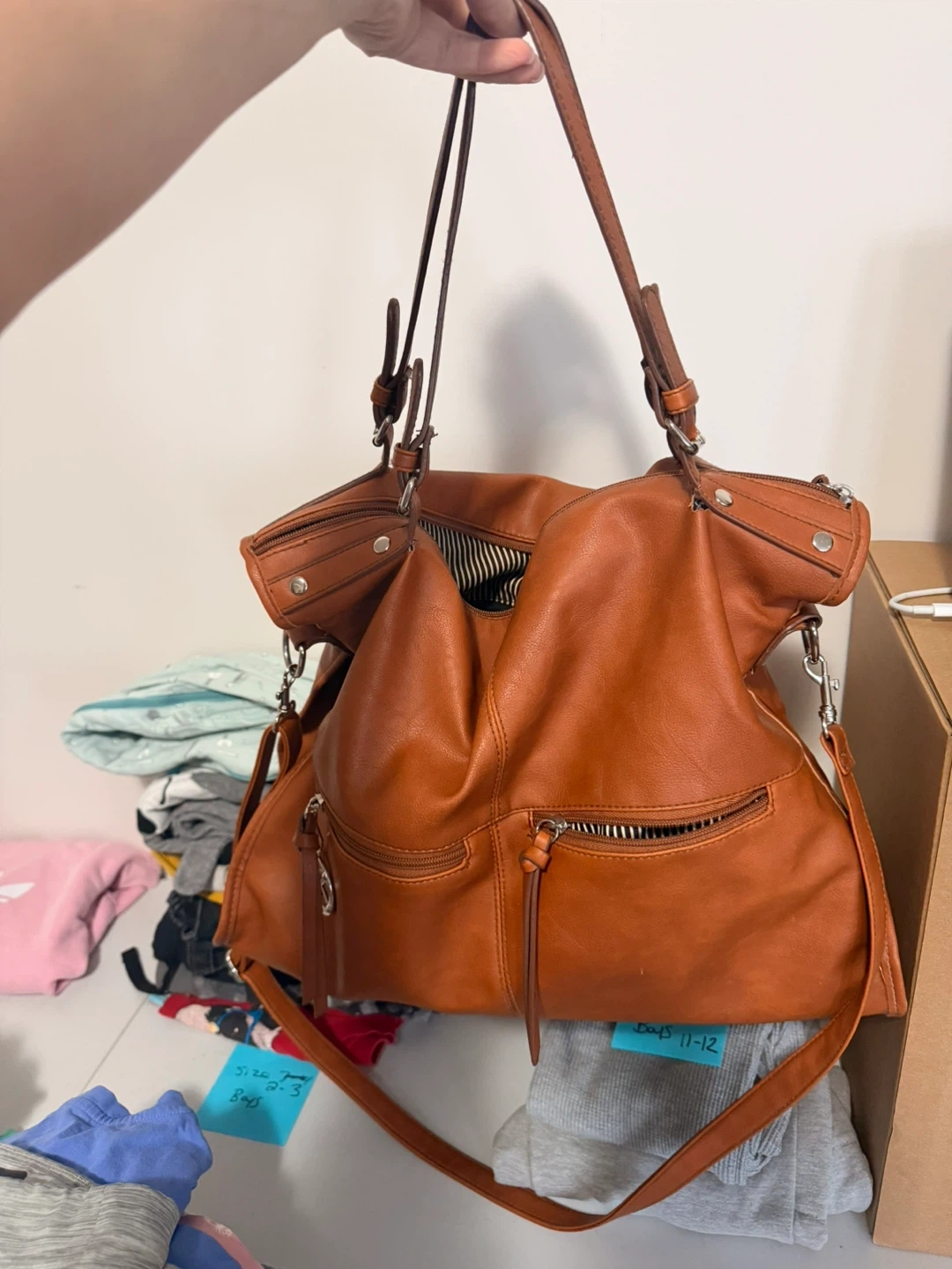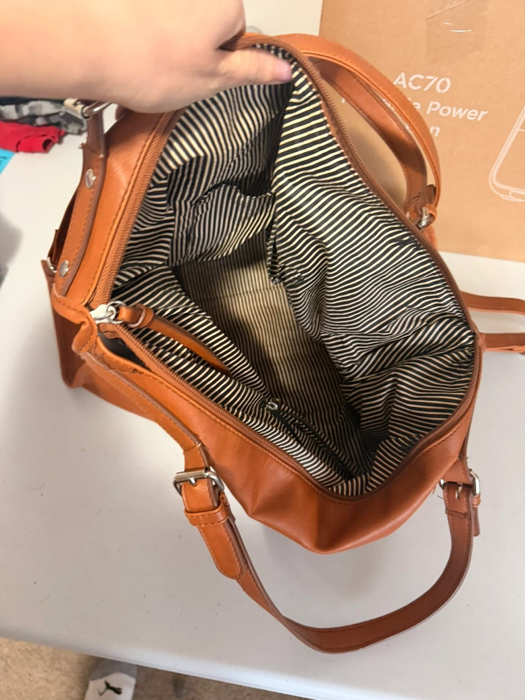 This stylish brown faux leather shoulder bag has a striped interior lining. It features multiple zippered pockets for organization. A versatile bag for everyday use!
