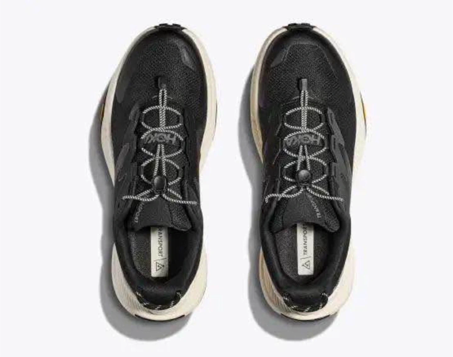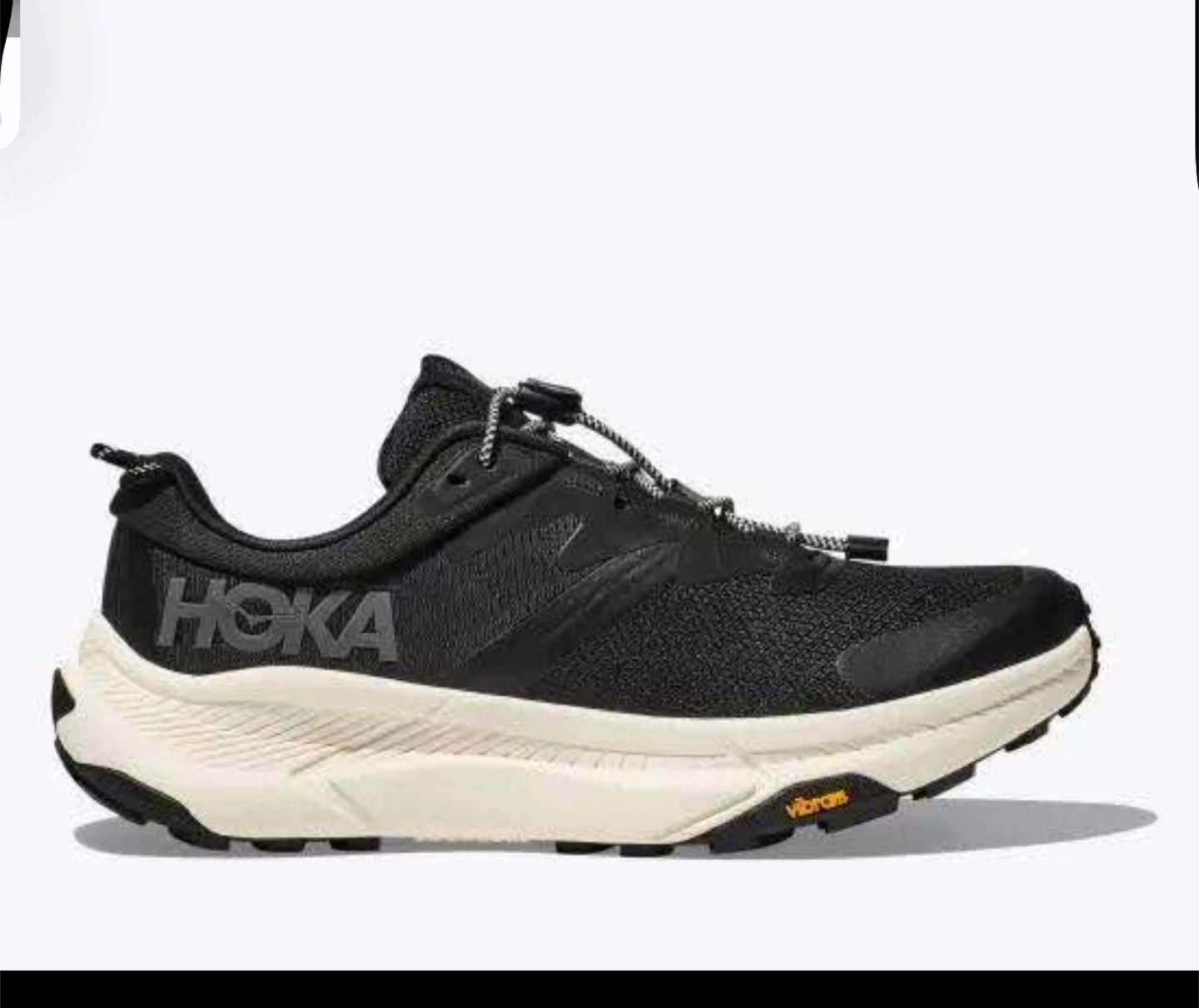 These Hoka trail running shoes are black with a cream-coloured sole. They feature a speed-lacing system and Vibram outsole for traction. Ideal for hitting the trails!