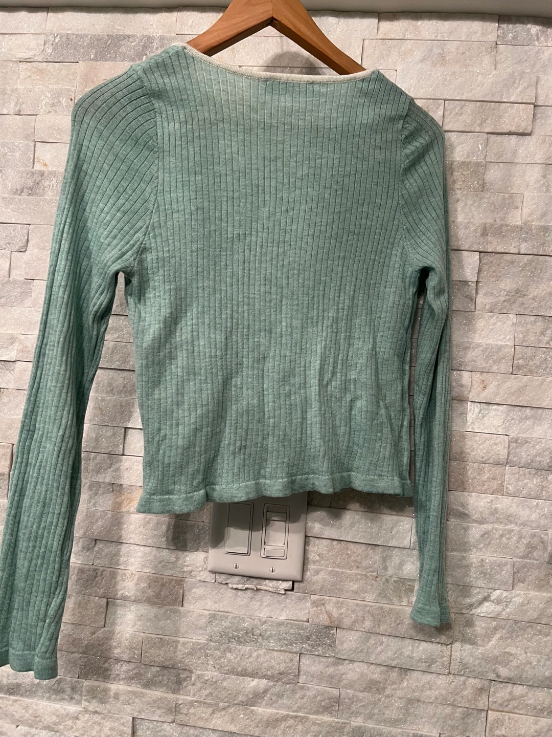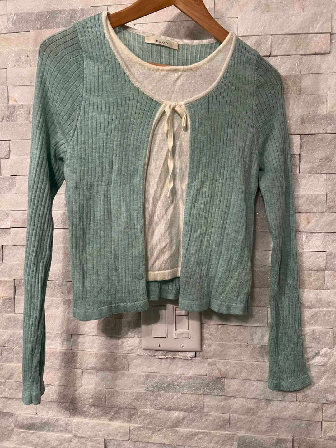 Selling a cute Ohoo cardigan and top set! It's a lovely light green colour and features a ribbed texture. Perfect for layering or wearing on its own