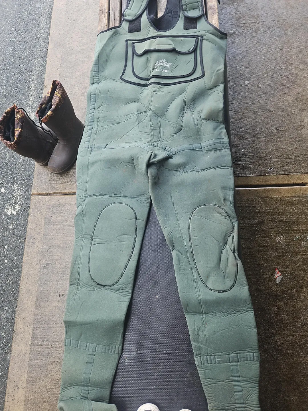 Green neoprene chest waders with rubber boots attached. These waders are designed to keep you dry while fishing or working in water. They have reinforced knee pads for durability.