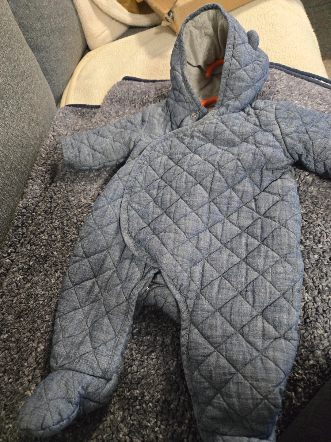 Here's a cozy quilted denim pram suit from Baby Gap! It's in great condition and perfect for keeping your little one warm. The suit features a hood and snap closures for easy dressing. Great for outings!