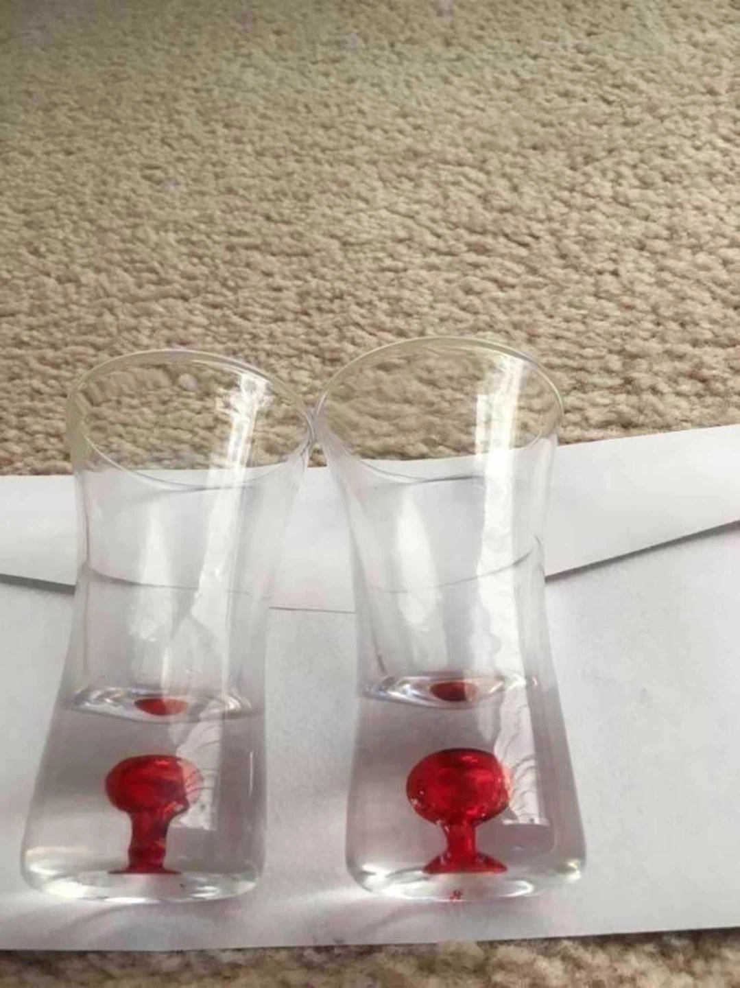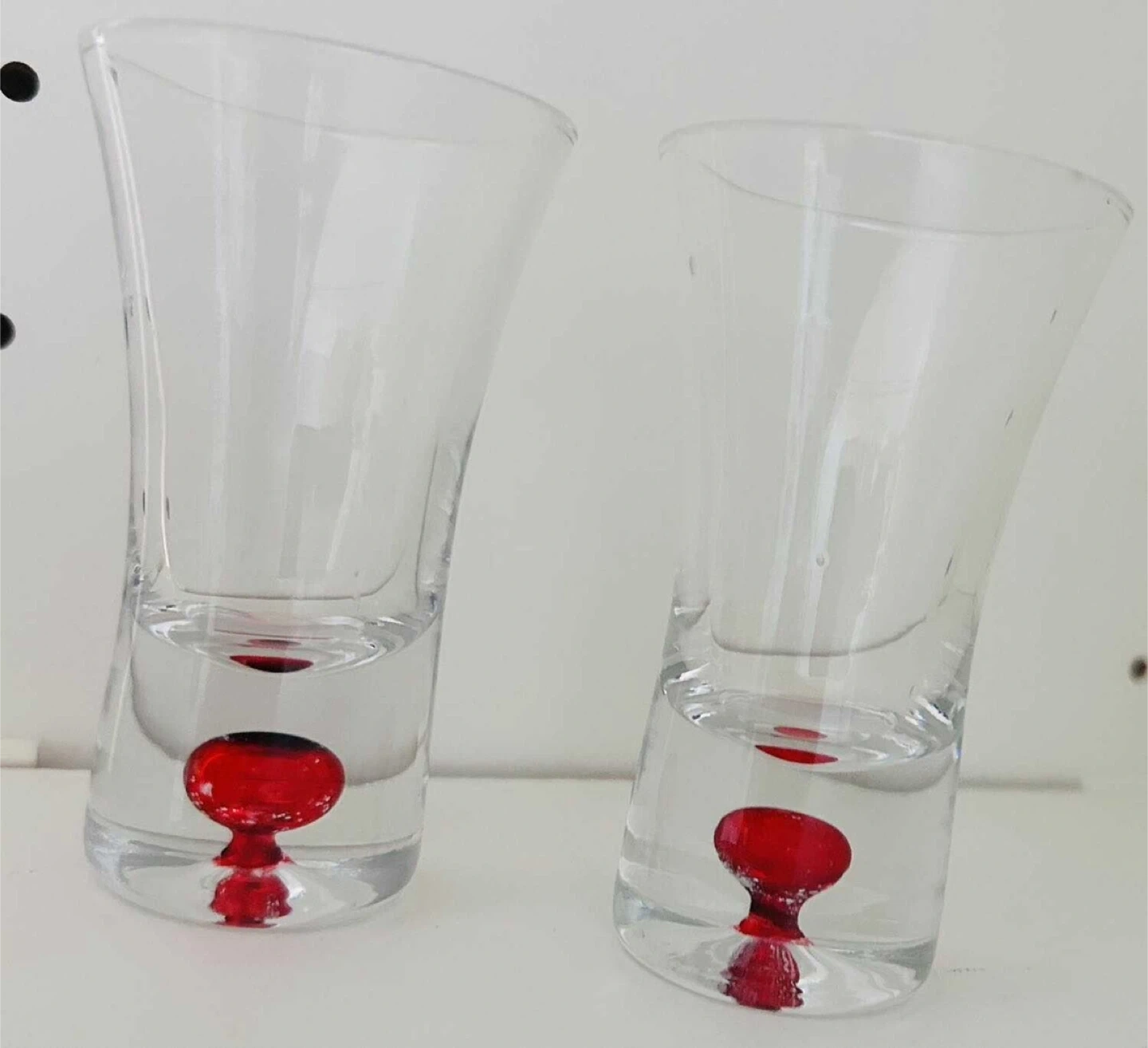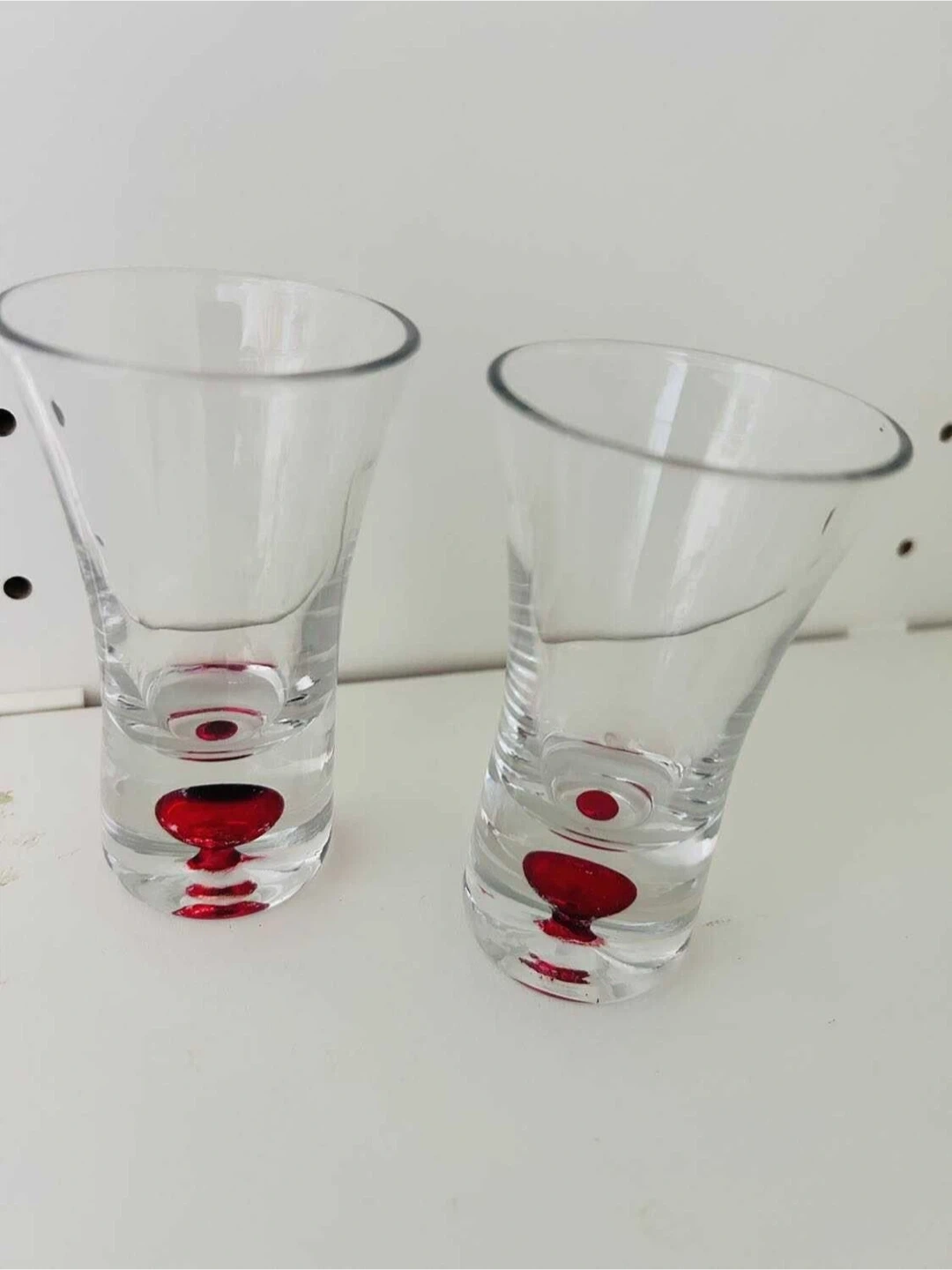 Two clear glass shot glasses are included. Each glass features a red decorative element at the base. These glasses are a fun addition to any home bar!