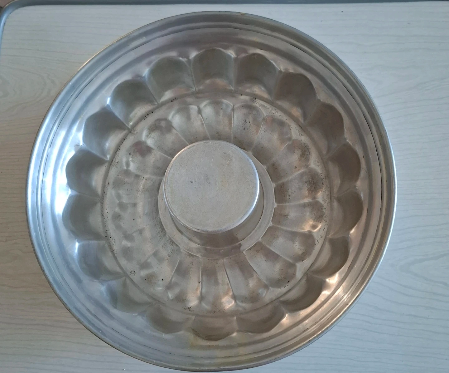 This is a bundt cake pan. It's made of aluminum with a fluted design. Perfect for baking your favourite cakes!