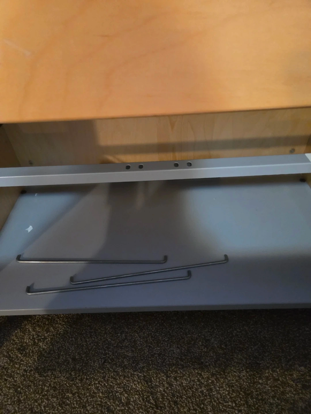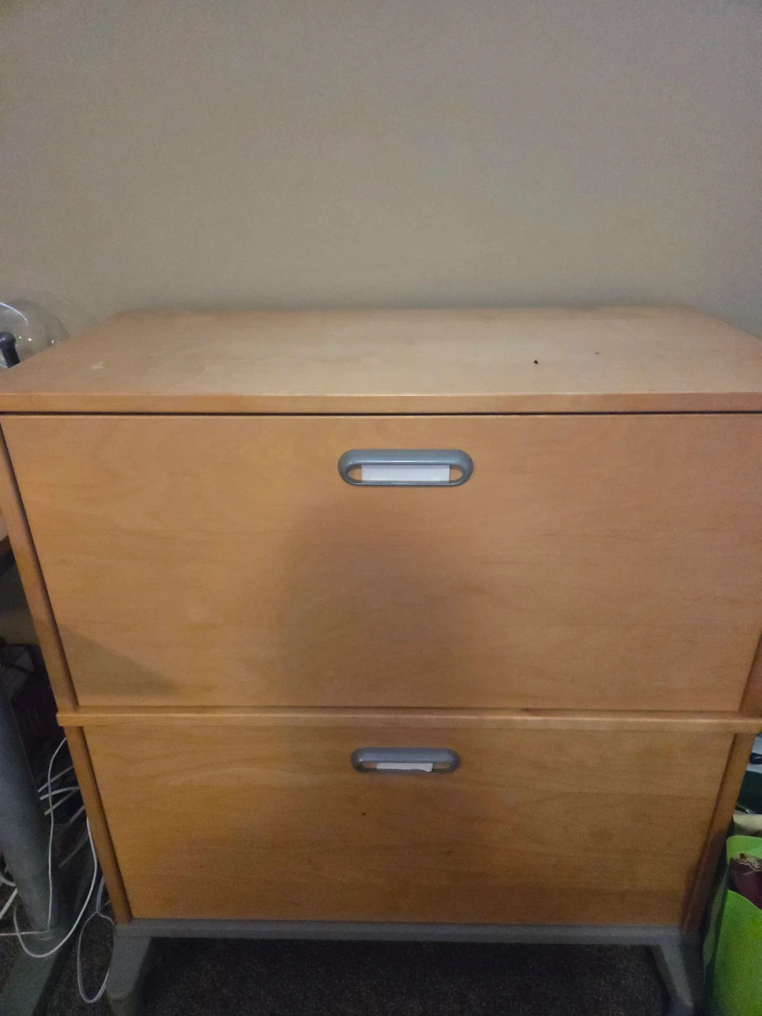 This is a two-drawer filing cabinet with a light wood finish. It has metal drawer pulls and is made of wood. The drawers appear to be suitable for hanging files.