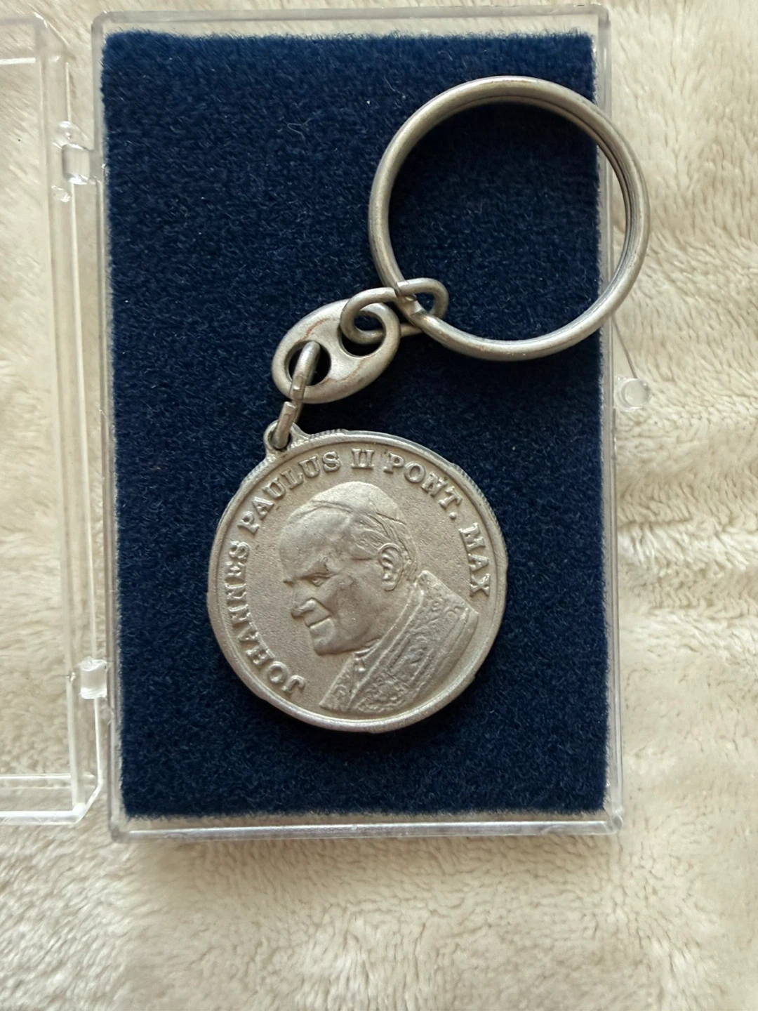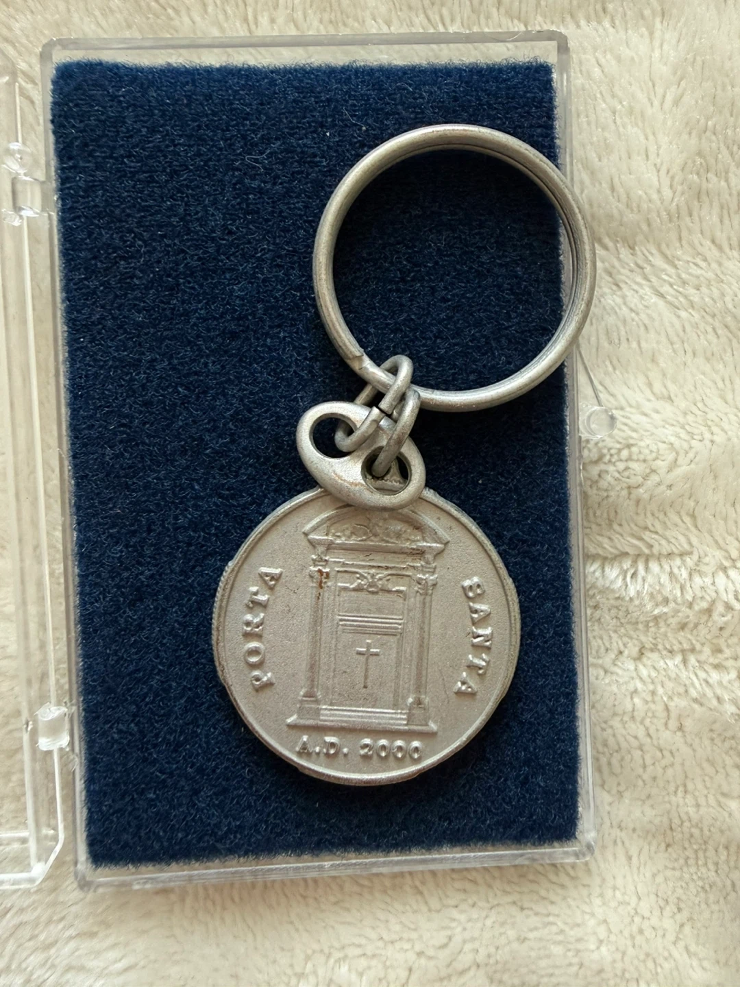Commemorative keychain featuring Pope John Paul II and the Holy Door. Engraved with 'Iohannes Paulus II Pont. Max' on one side and 'Porta Santa A.D. 2000' on the other. Comes in a protective case.