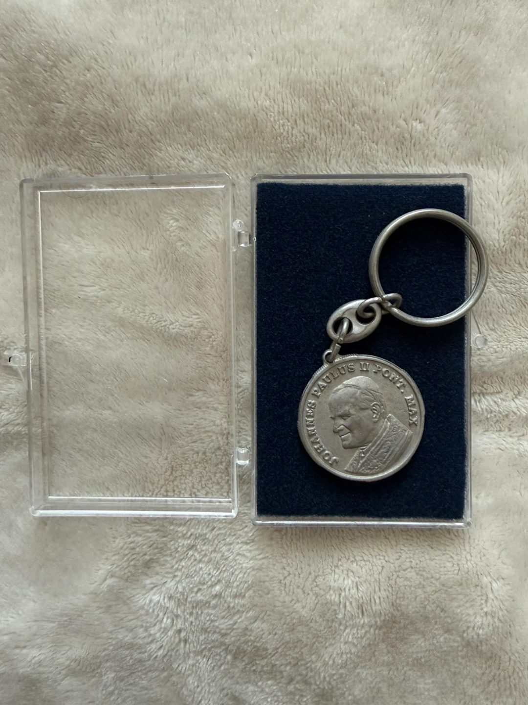 Commemorative keychain featuring Pope John Paul II and the Holy Door. Engraved with 'Iohannes Paulus II Pont. Max' on one side and 'Porta Santa A.D. 2000' on the other. Comes in a protective case.
