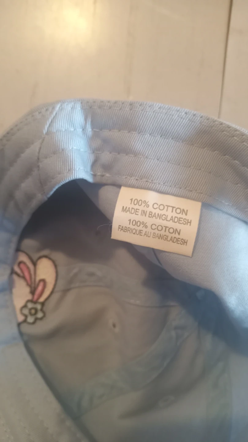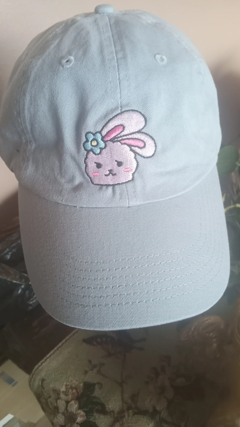 This baseball cap is made of 100% cotton. It features a cute embroidered bunny on the front. The adjustable strap ensures a comfortable fit for most sizes.