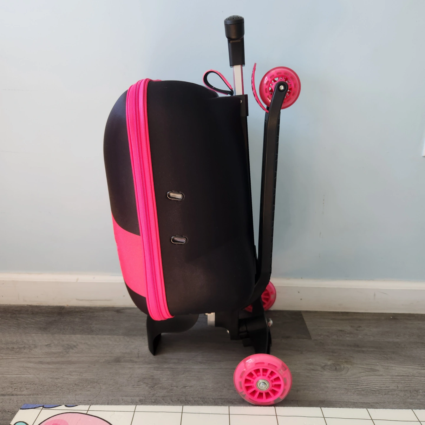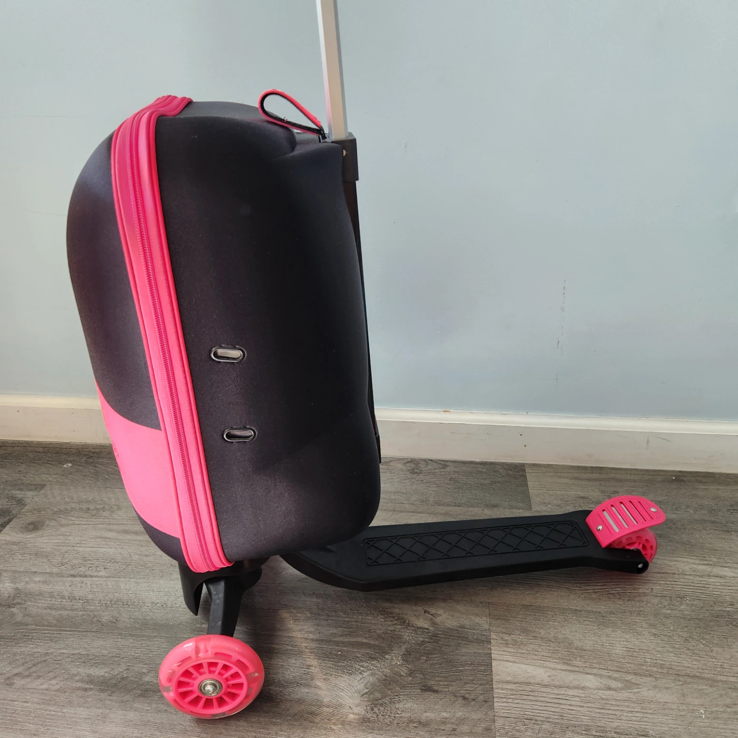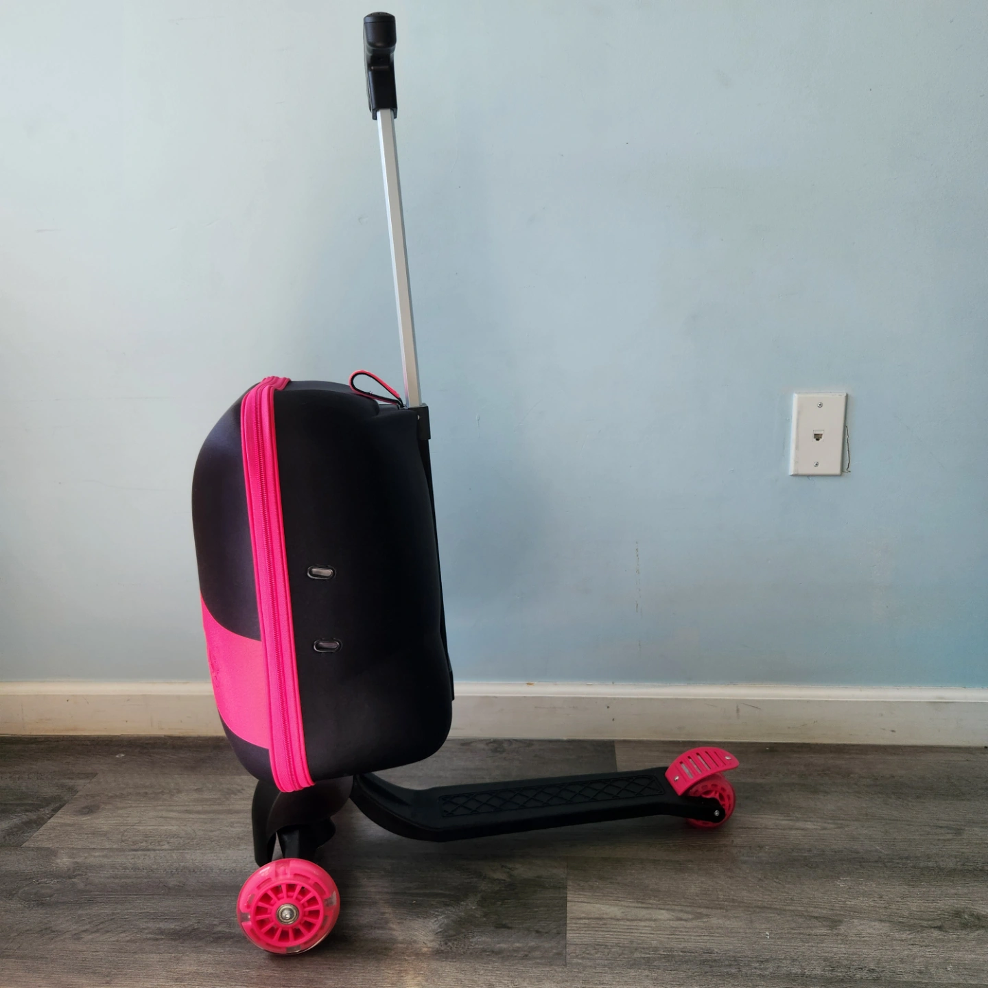 Kids rolling suitcase with scooter functionality. Black and pink color scheme. Features a telescoping handle and wheels. Great for travel.