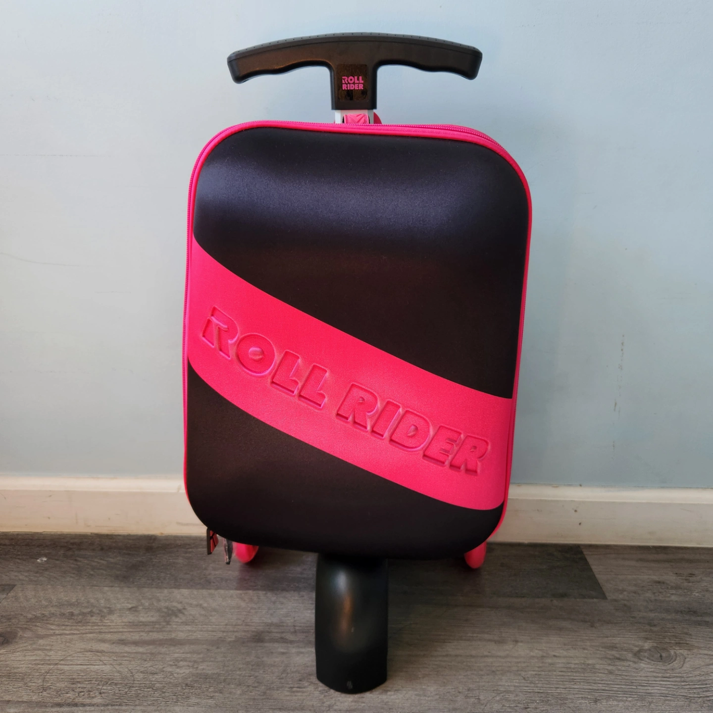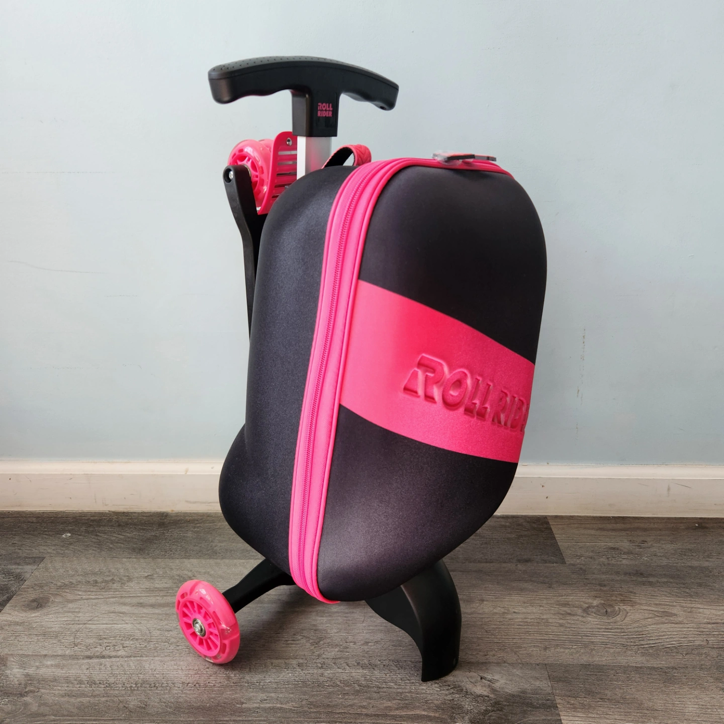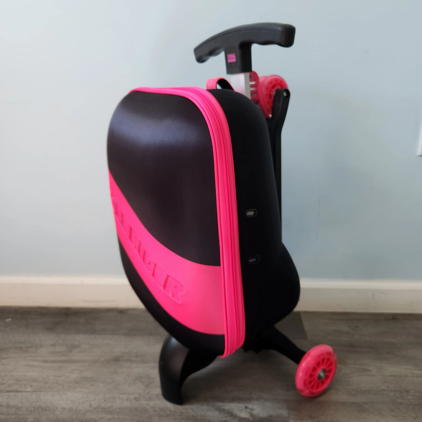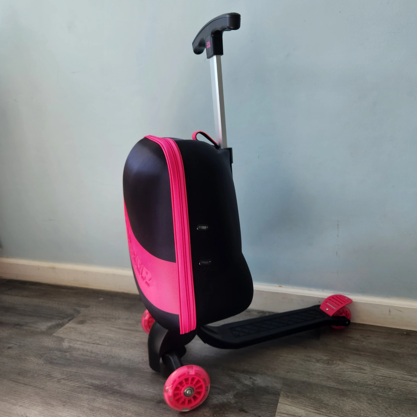 Kids rolling suitcase with scooter functionality. Black and pink color scheme. Features a telescoping handle and wheels. Great for travel.