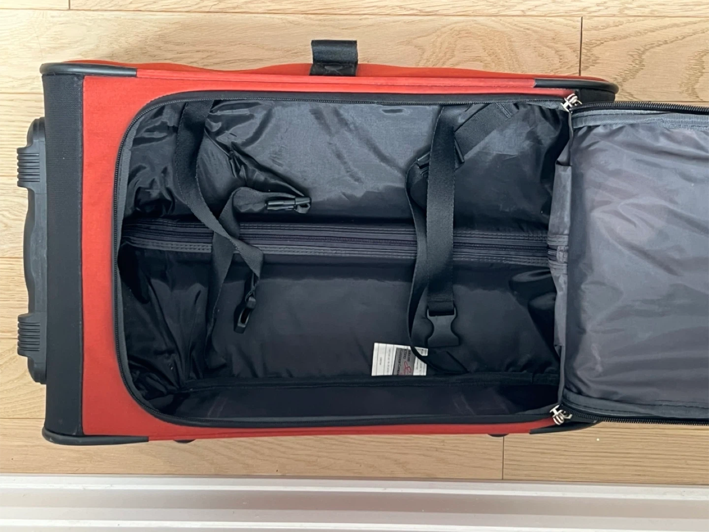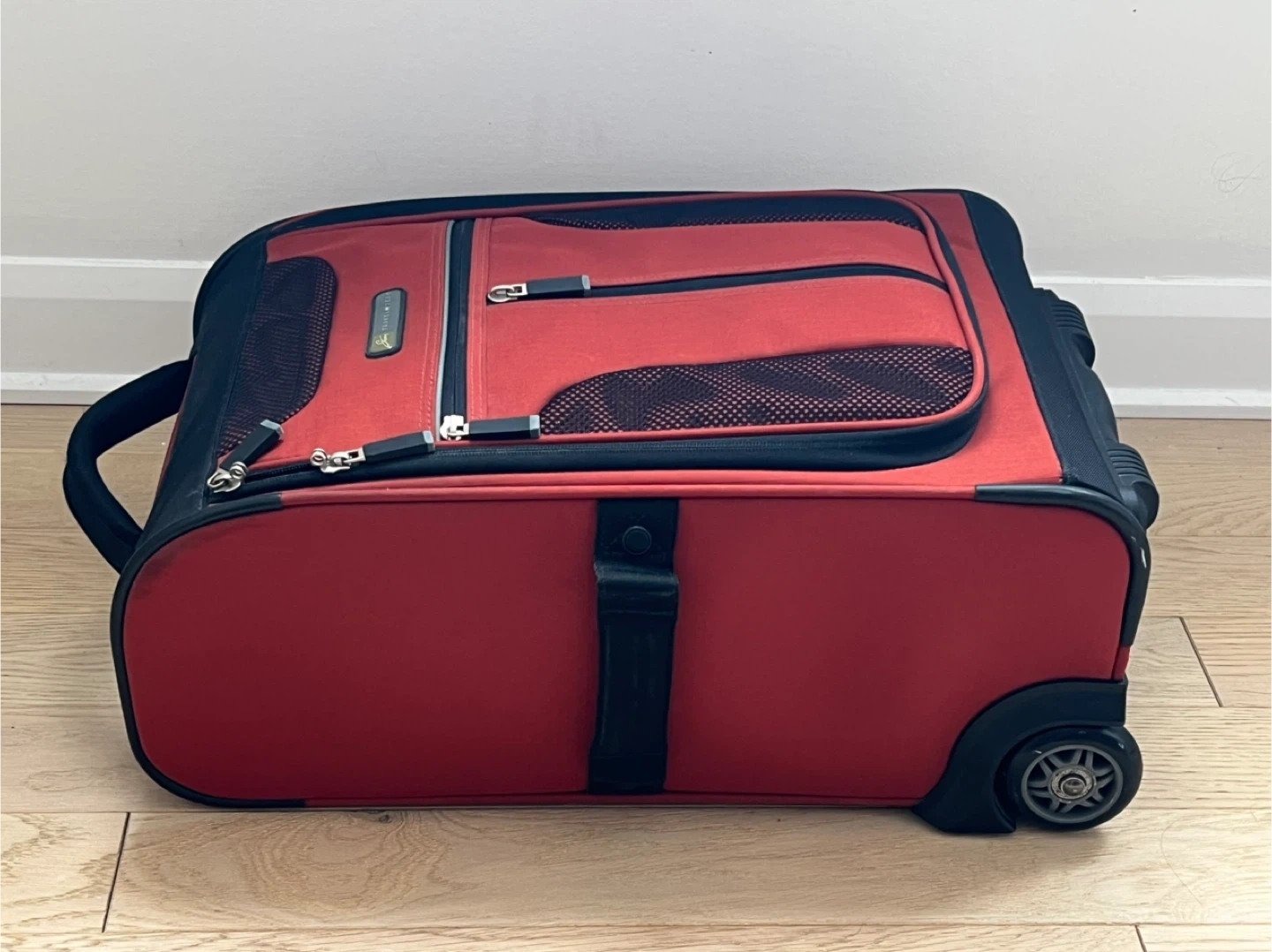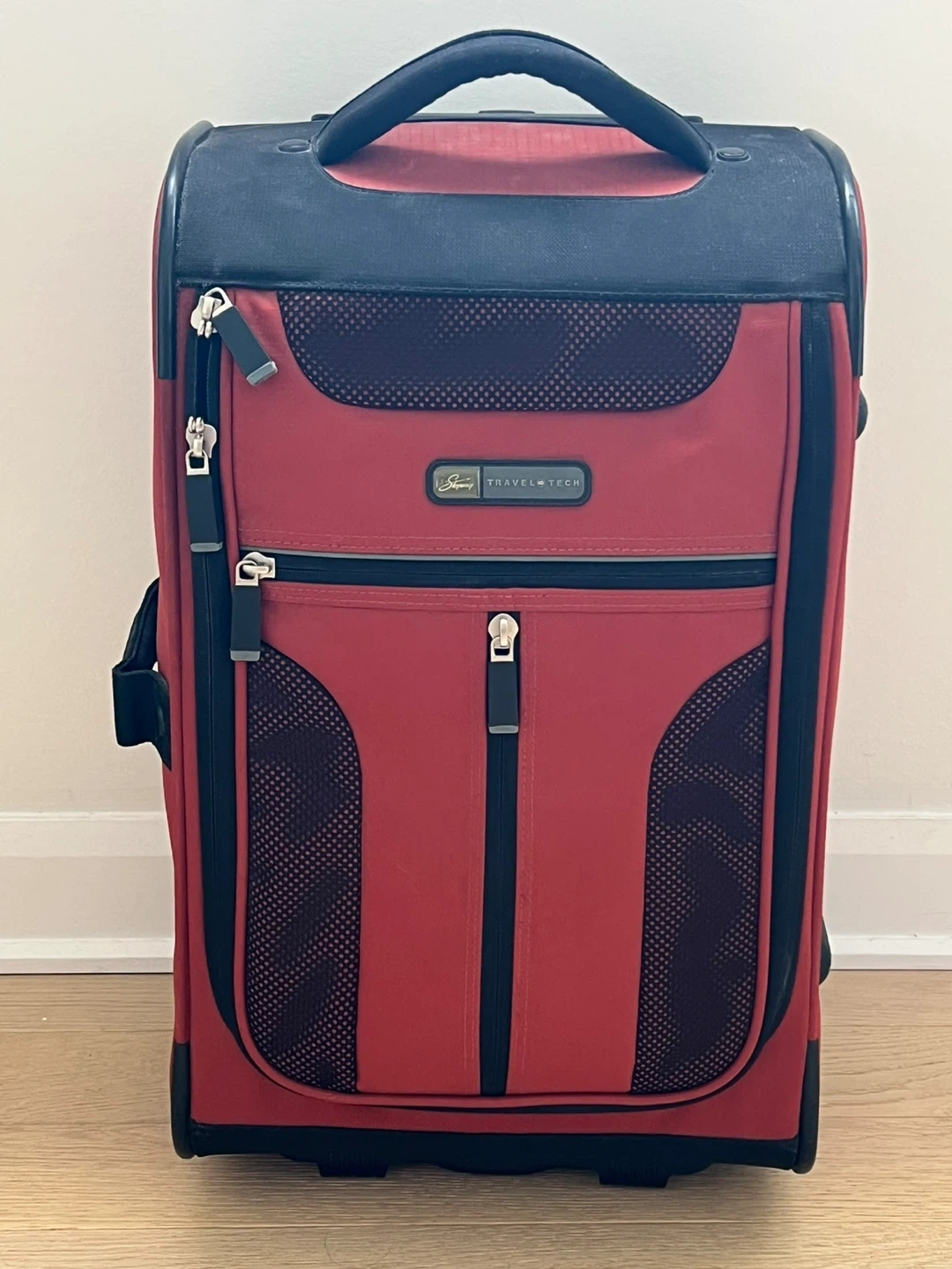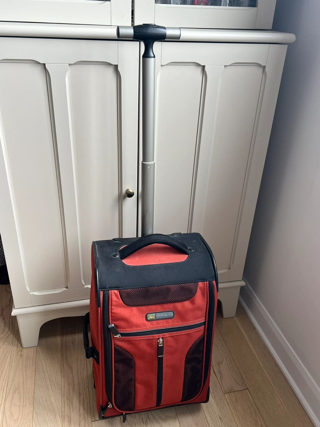 This orange Travel Tech carry-on rolling luggage is great for trips. It has a telescoping handle and wheels for easy transport. The interior features straps to keep your belongings secure.