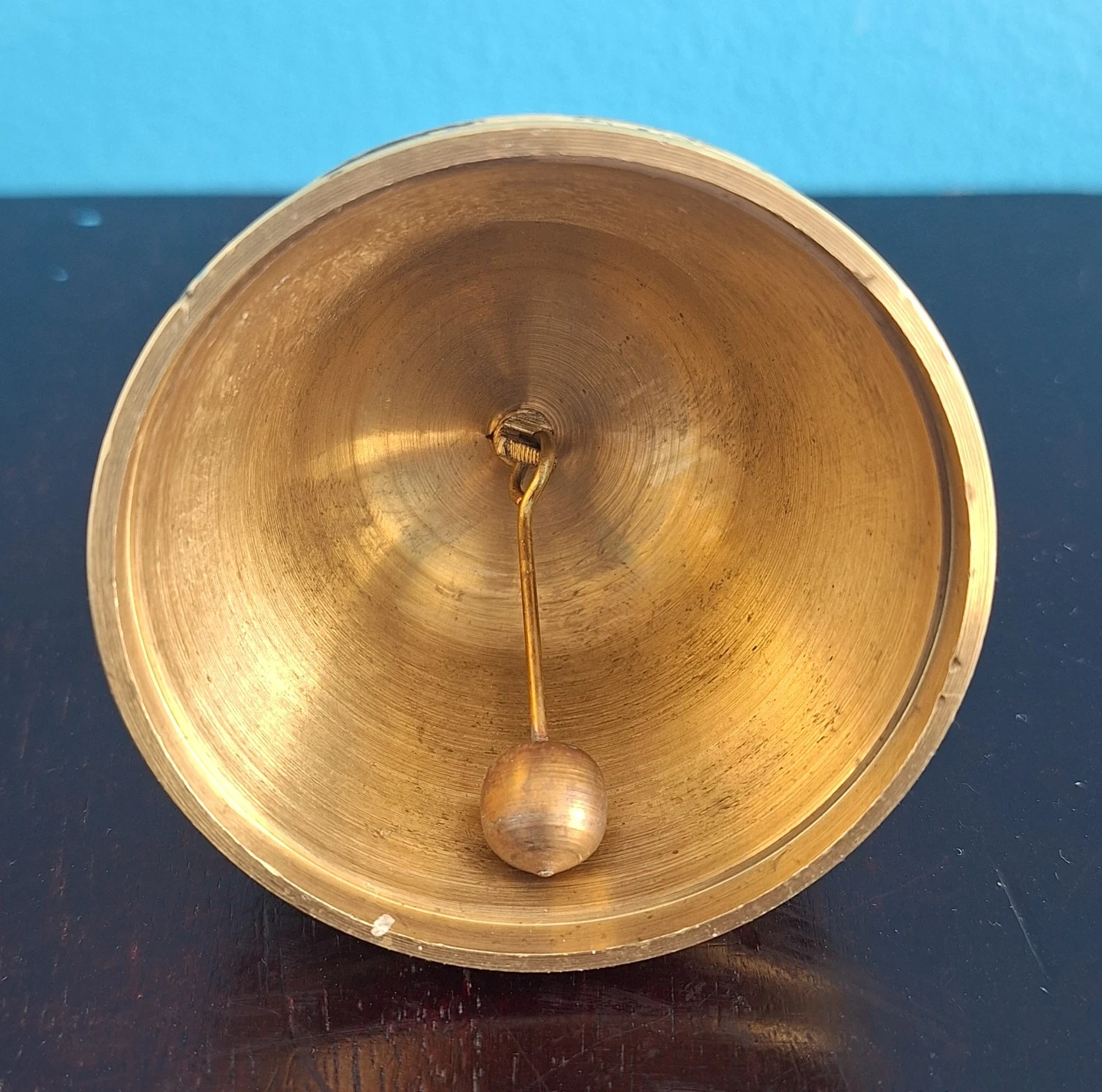 Decorative brass bell with a detailed rooster top. It's embossed with intricate patterns and animal scenes around the base. Also calked dinner bell.Really high quality item.