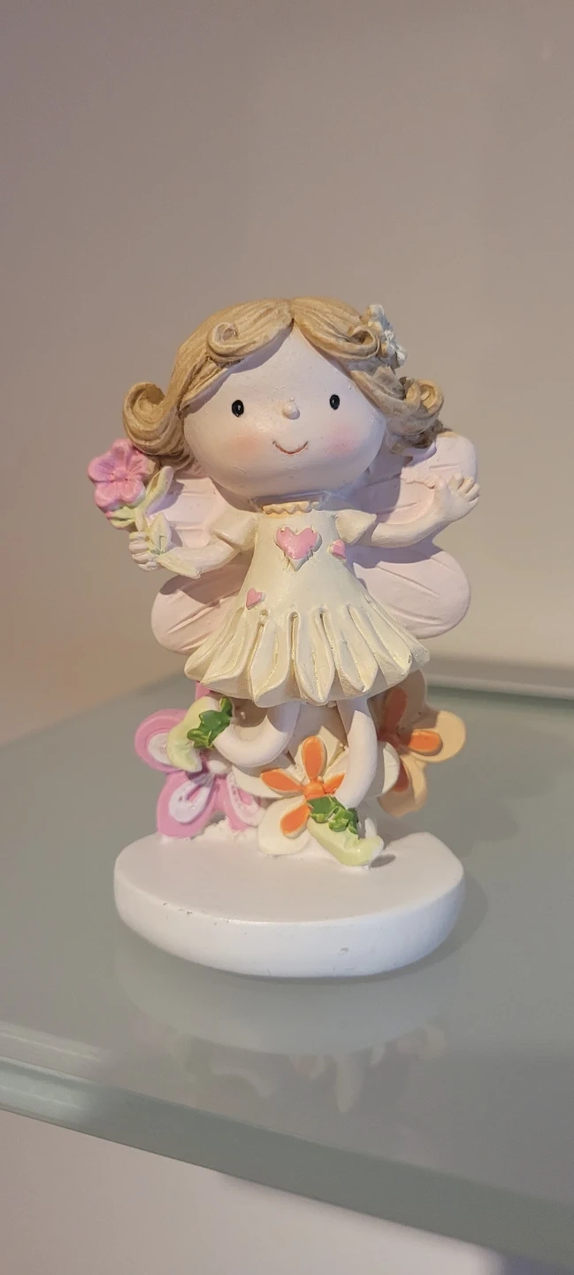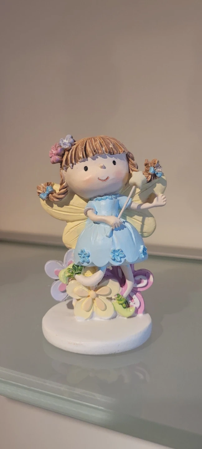 Two sweet fairy figurines, each with unique details. One wears a blue dress and holds a wand, while the other sports a cream-coloured dress with a heart accent. Both stand on a floral base. A charming addition to any decor!