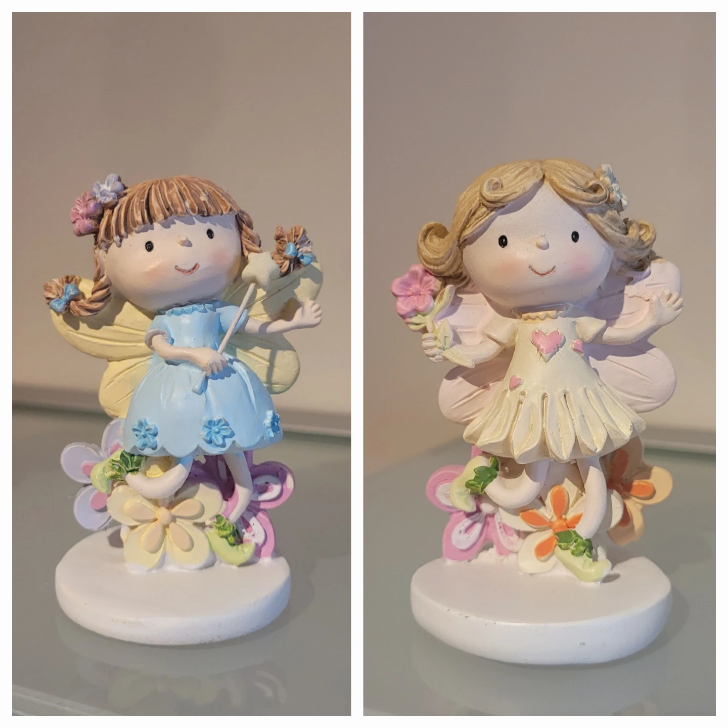 Two sweet fairy figurines, each with unique details. One wears a blue dress and holds a wand, while the other sports a cream-coloured dress with a heart accent. Both stand on a floral base. A charming addition to any decor!