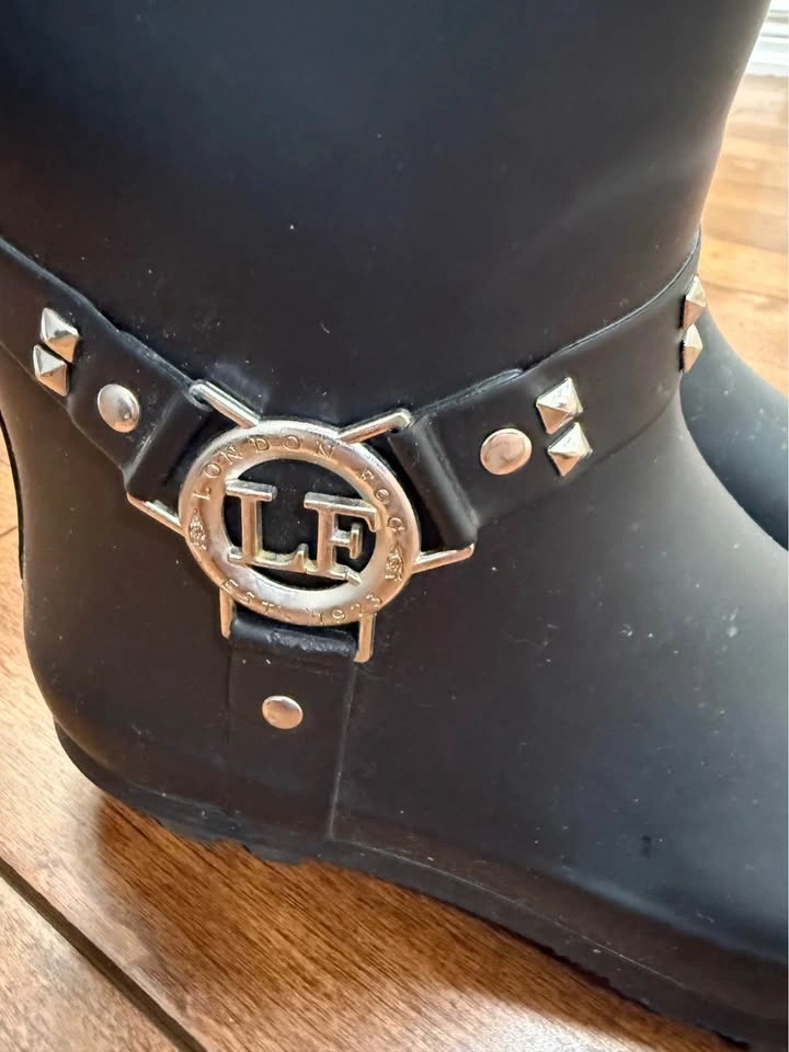 Stylish London Fog waterproof rubber boots. Black with cool studded design and a silver buckle that has the LF logo. Size 37. Great for rainy days!