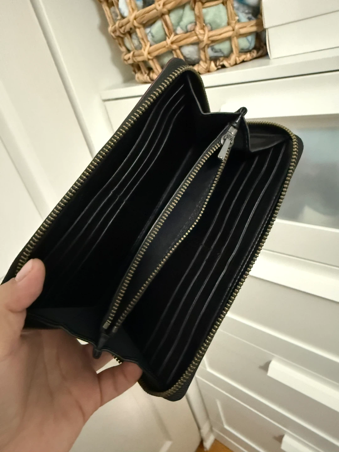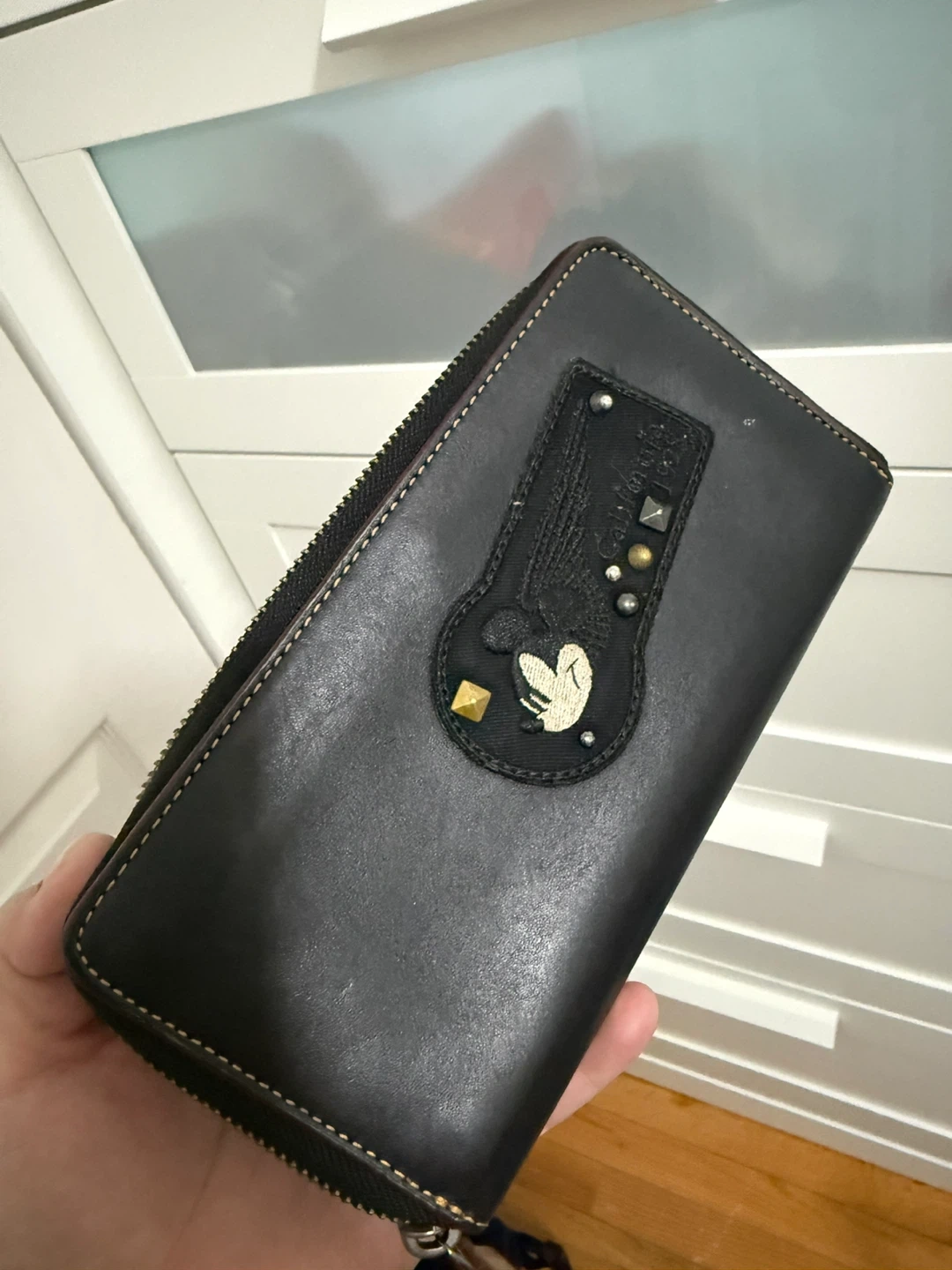 This black leather zip-around wallet features a fun collaboration with Disney, showcasing Mickey Mouse designs with stud embellishments. It's a stylish accessory for any fan. The interior has multiple card slots and a zippered coin pocket. Authentic