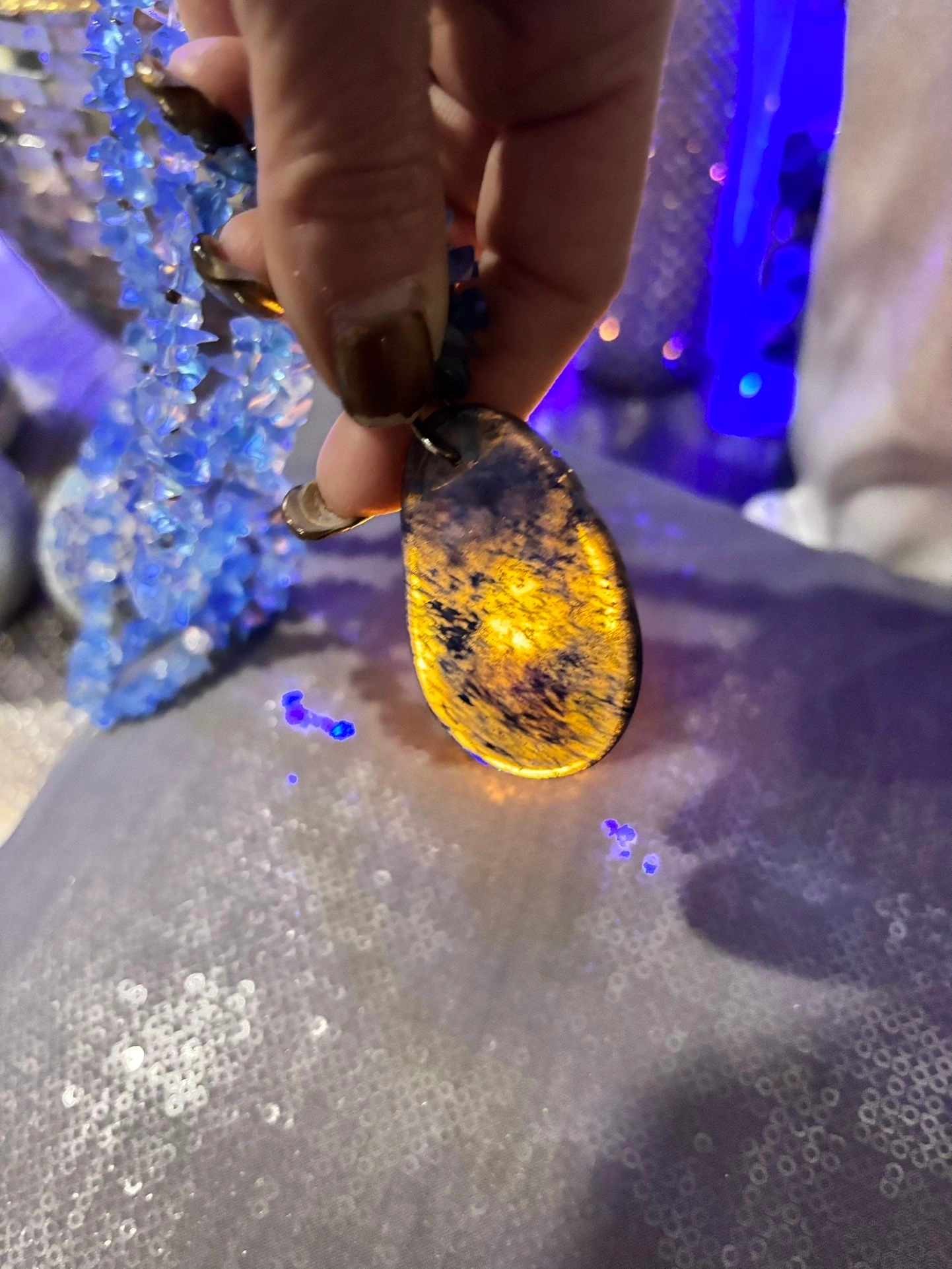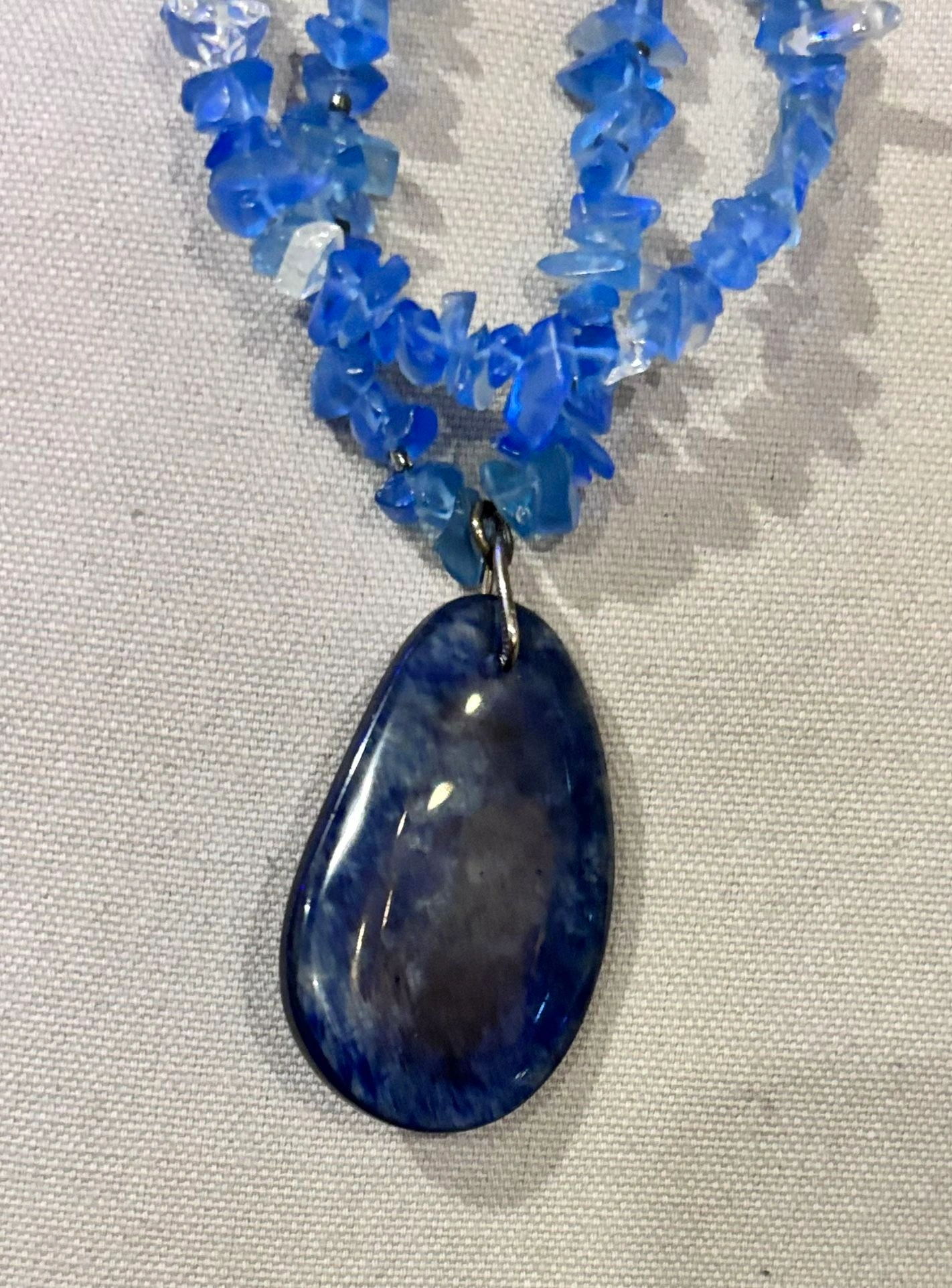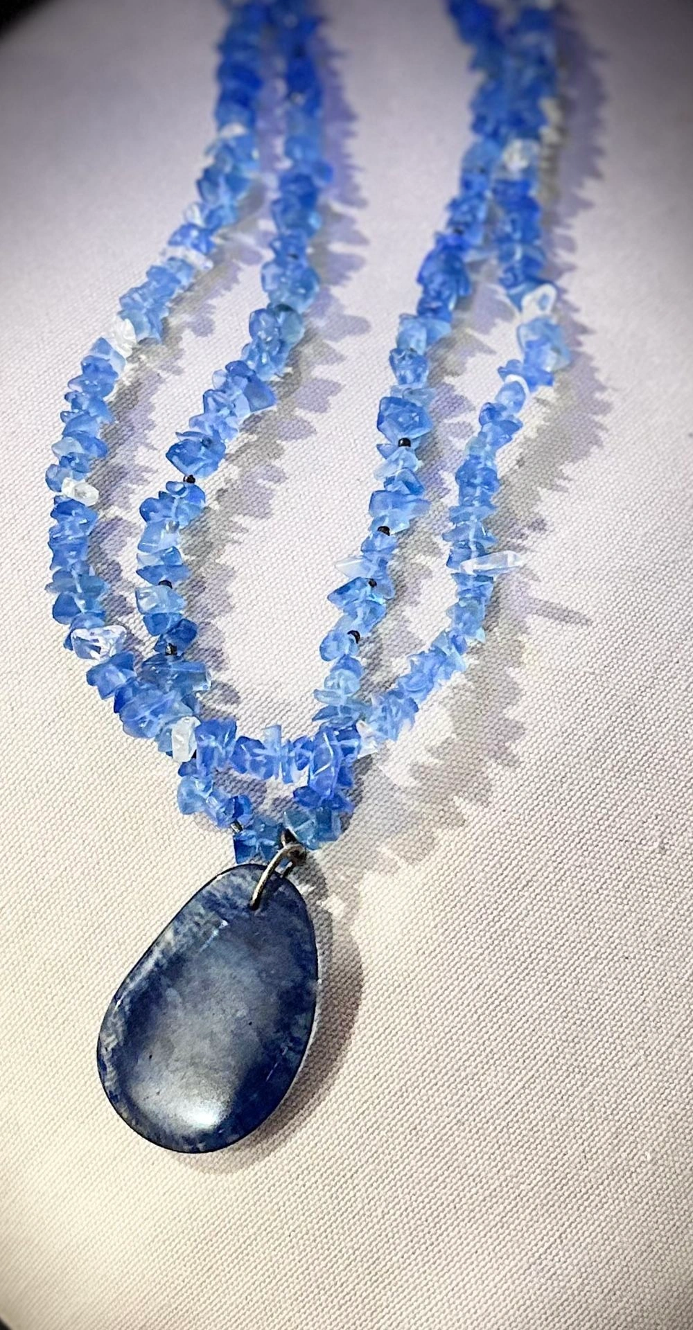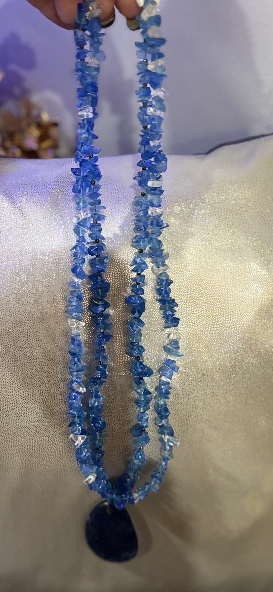 Beautiful blue quartz chip necklace featuring a smooth polished stone pendant. This piece is hand-strung with layered blue and clear quartz chips that create a rich, ocean-inspired look. The pendant adds a bold yet elegant finish, making it perfect for both casual and dressy outfits. Length: approx. 12 inches from clasp to bottom of pendant. Color: blue with natural variations. Closure: silver-tone lobster clasp. Style: statement / boho / artisan. Construction: hand-strung. Material: quartz (chips + polished stone). Each stone varies naturally in color and shape, making this necklace truly one of a kind. Pre-owned, in very good condition. Clean and ready to wear. Perfect for layering or wearing alone as a statement piece.