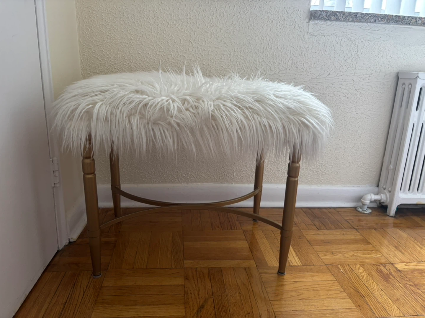 This stool features a fluffy white faux fur seat with gold-toned metal legs. It's a stylish accent piece for any room. Its compact size makes it handy for smaller spaces.
