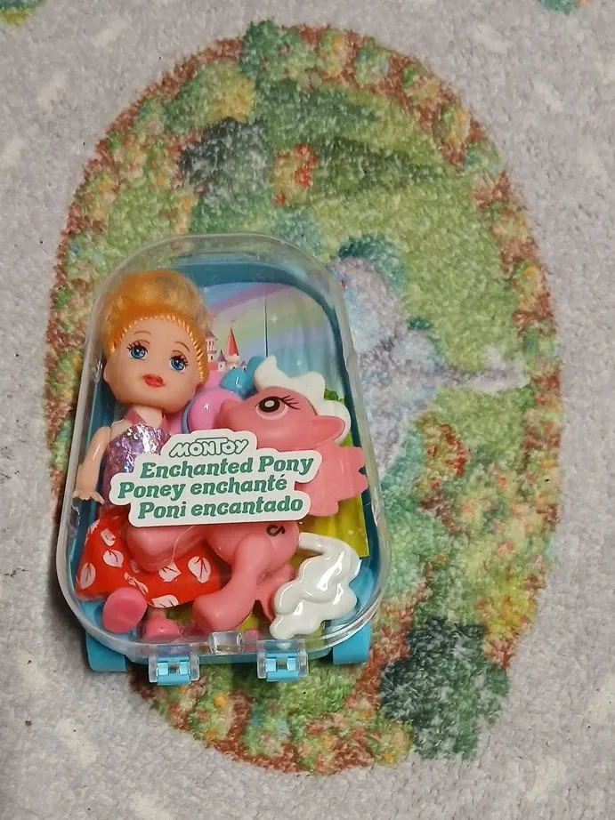 This is a cute MONTOY Enchanted Pony doll set! It includes a doll and a pink pony figure, all in a carrying case. Perfect for little ones who love dolls and ponies