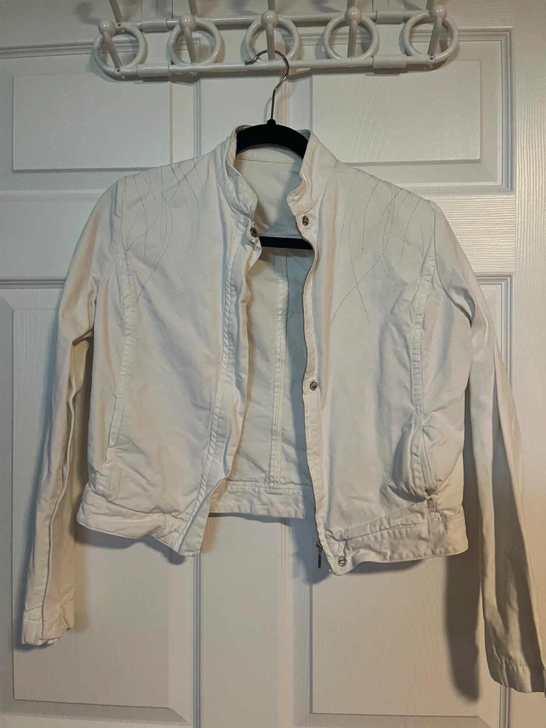 Selling a cute white denim jacket in size small. It's in great condition and has a unique design with subtle stitching. Perfect for layering or wearing on its own!