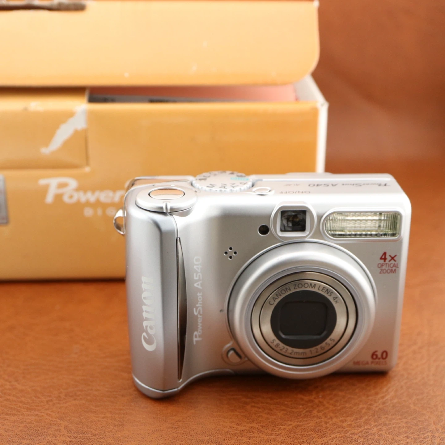 This is a silver Canon PowerShot A540 digital camera. It features 6.0 megapixels and 4x optical zoom. Includes original box.