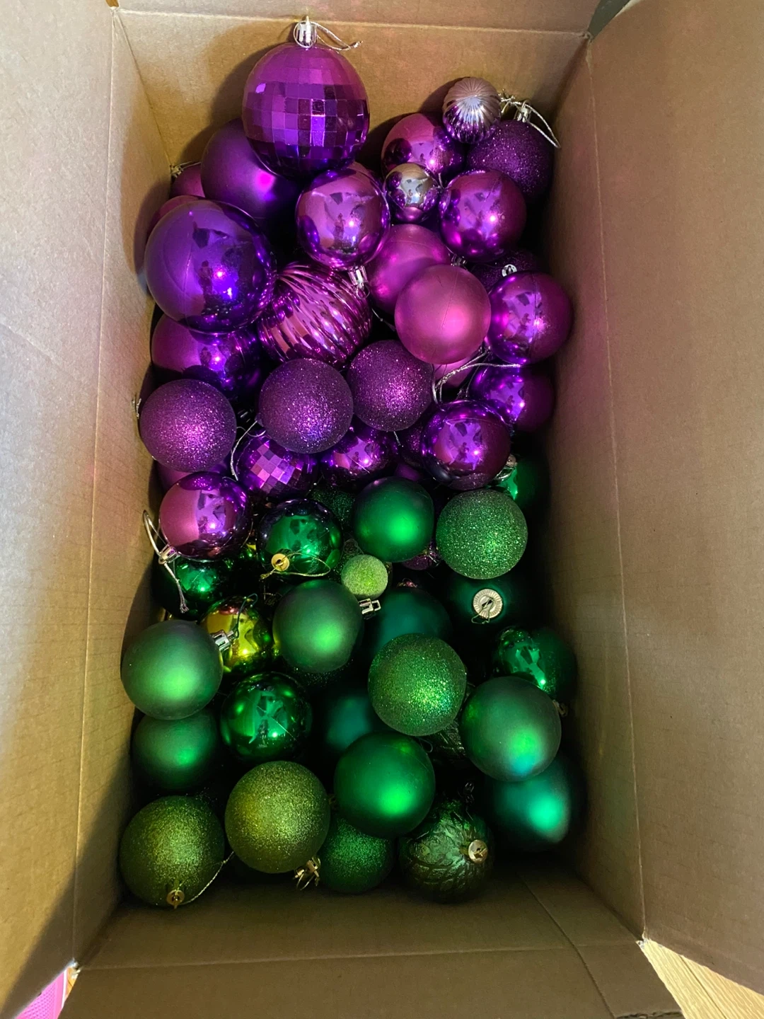 A collection of Christmas ornaments in shades of purple and green. Includes various sizes and finishes, some glittered and some shiny. Also includes a gold star tree topper and some decorative garland hooks.