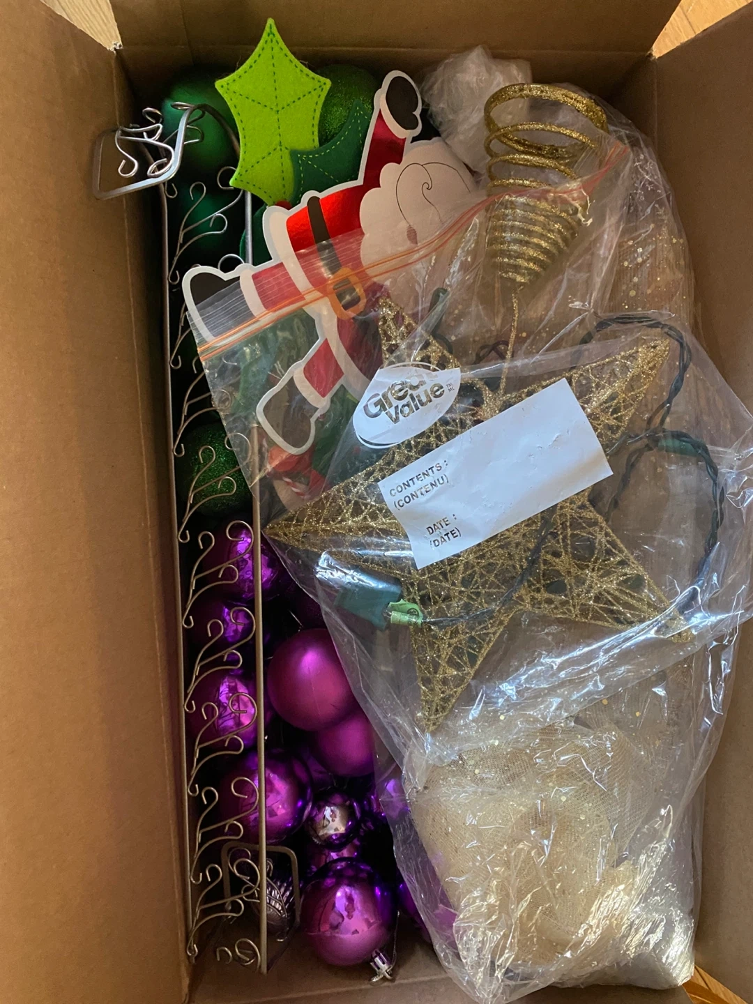 A collection of Christmas ornaments in shades of purple and green. Includes various sizes and finishes, some glittered and some shiny. Also includes a gold star tree topper and some decorative garland hooks.