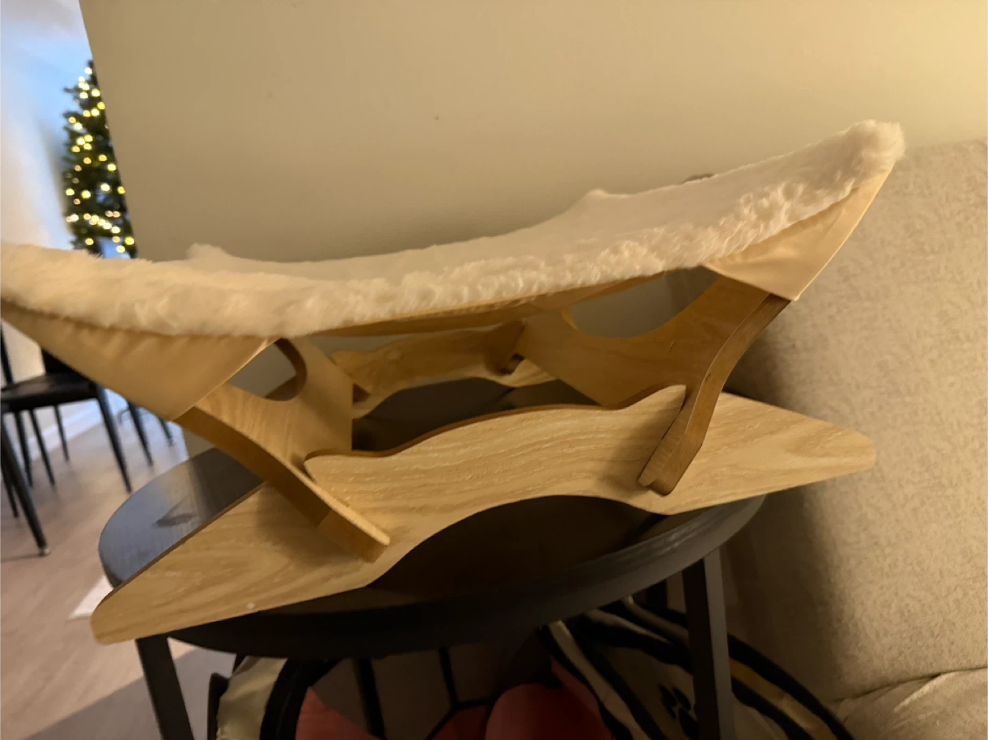 This cat hammock bed features a cozy cream faux fur cushion on a natural wood frame. It's designed for comfort and style in any room. Provides a comfy spot for your cat to lounge!