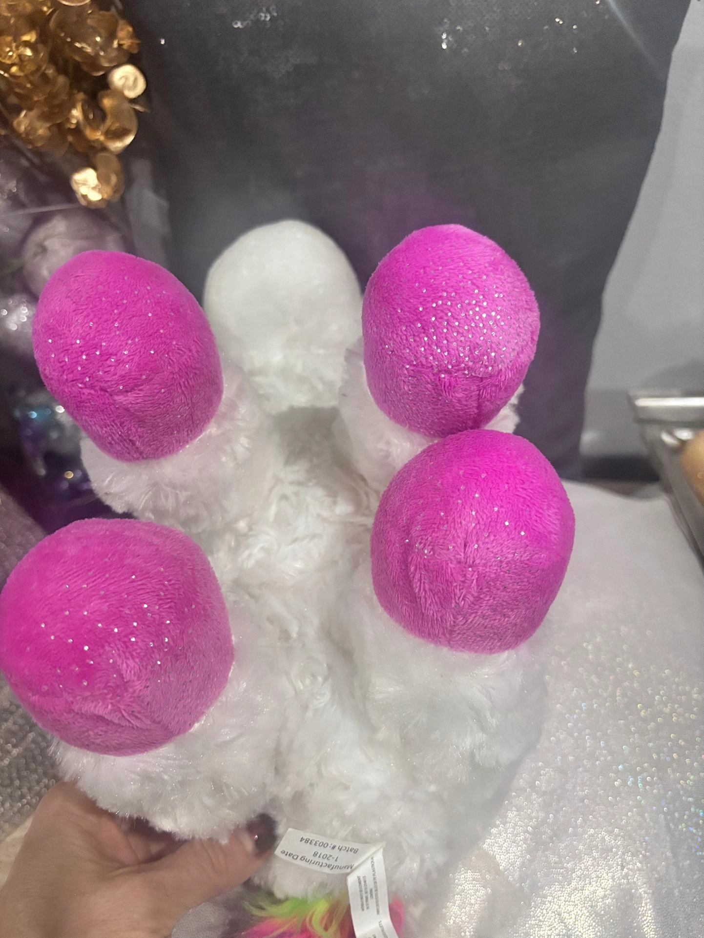 Adorable Petting Zoo unicorn plush in excellent condition. Super soft and cuddly with bright rainbow mane and tail, sparkly pink hooves, and a shiny unicorn horn. Clean and well cared for. No stains, rips, or odors. Smoke-free home. Perfect for play, display, or gifting. Size: Approximately 11 inches long. A sweet, high-quality plush that is ready for a new home! Great gift idea for unicorn lovers.