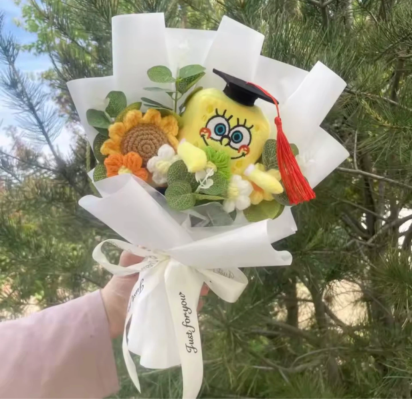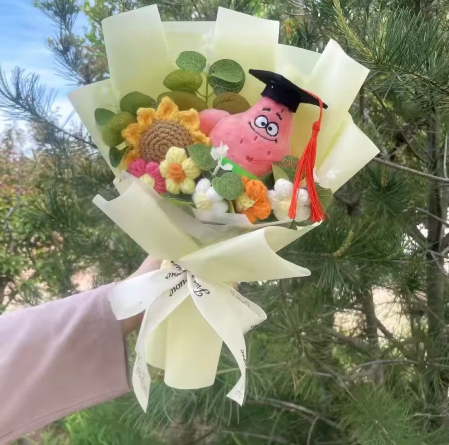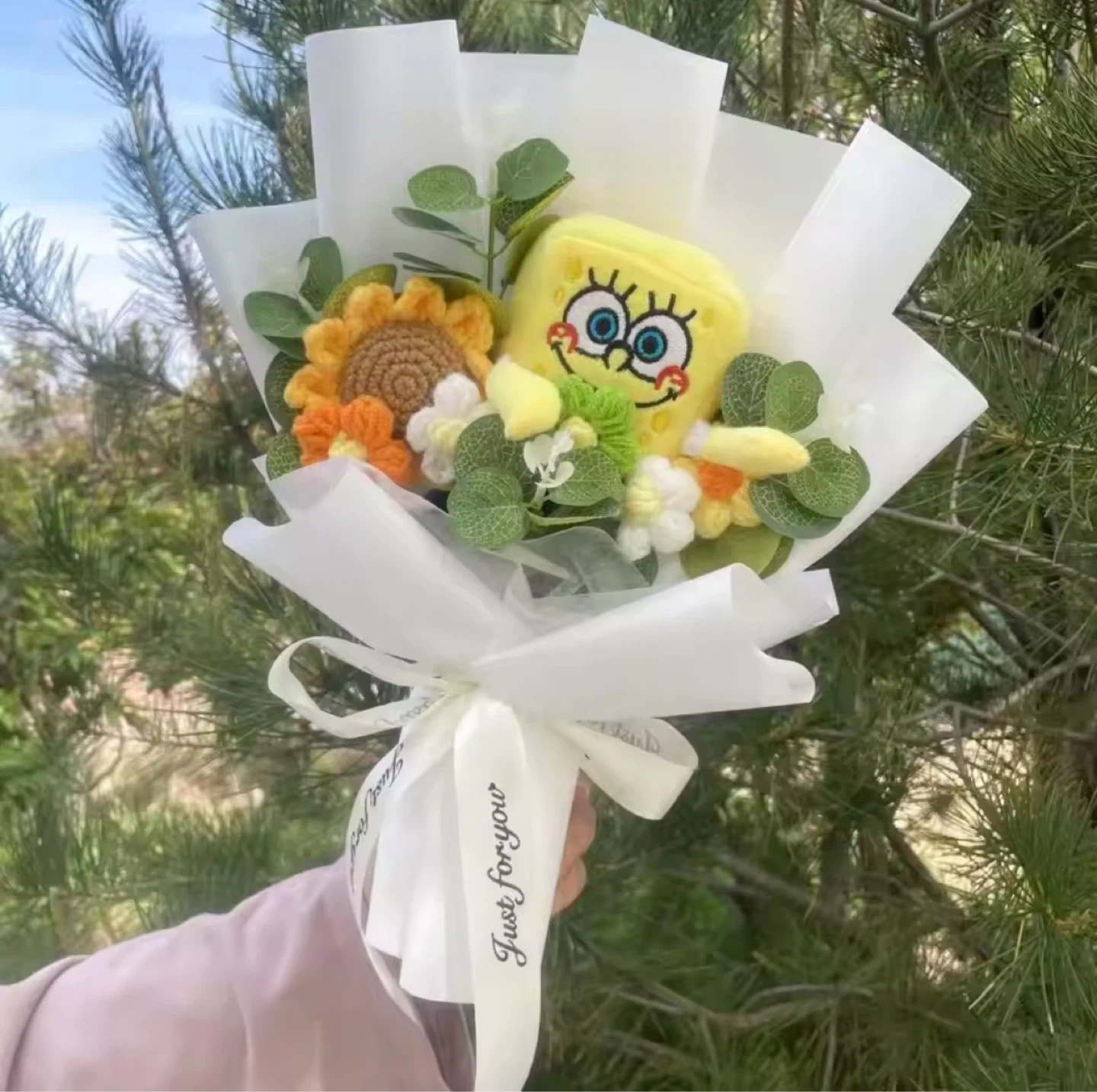 This fun bouquet features plush toys of SpongeBob and Patrick Star. It's a unique gift for fans of the show. Comes with crocheted flowers and decorative greenery.