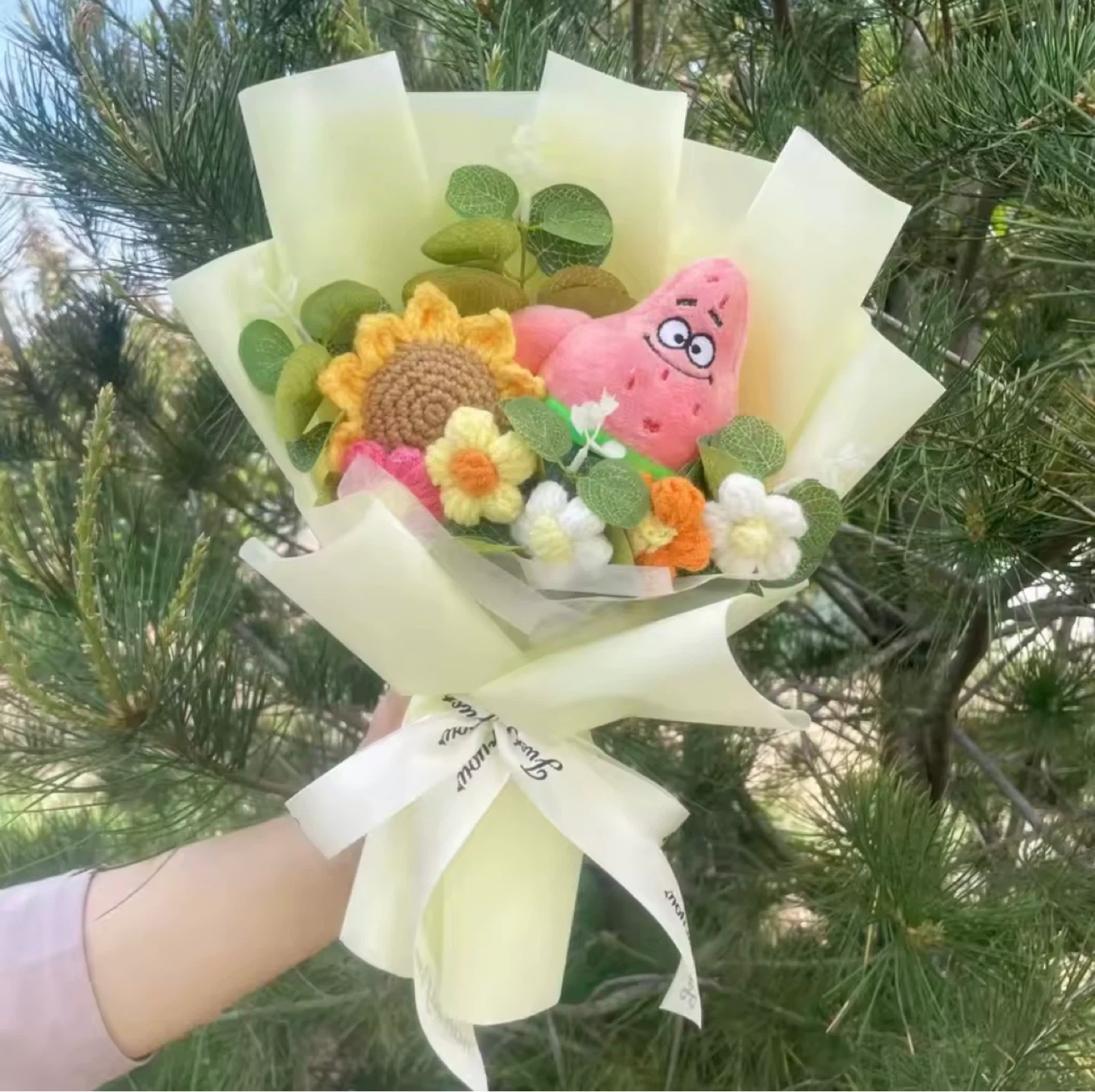 This fun bouquet features plush toys of SpongeBob and Patrick Star. It's a unique gift for fans of the show. Comes with crocheted flowers and decorative greenery.