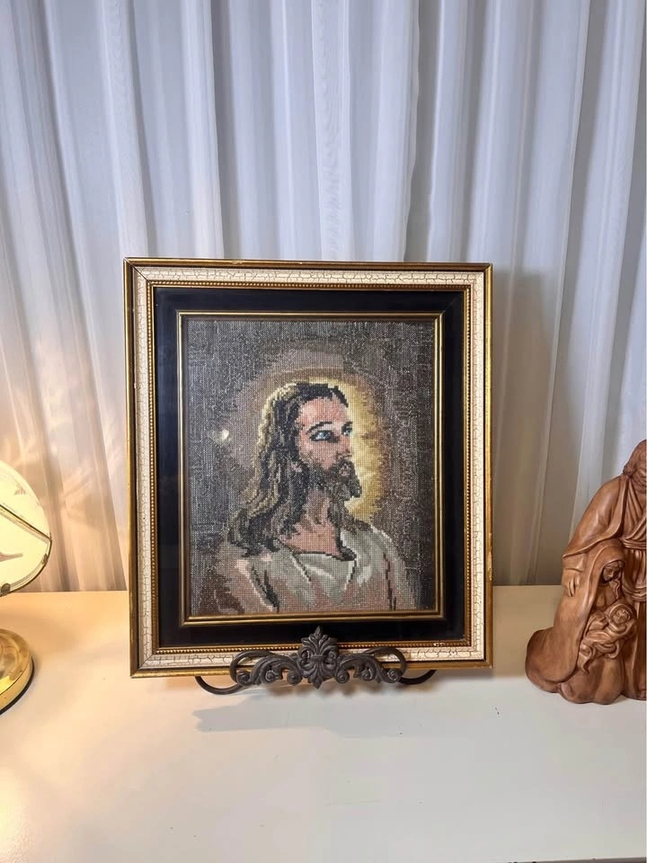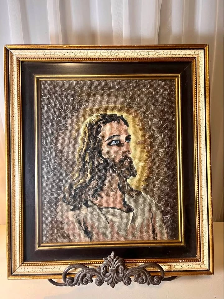 Vintage Jesus cross stitch framed wall hanging. 15 inches width, 17 inches height. In good vintage condition, minor peeling paint on frame due to its age. Pickup in Calder, Northside of Edmonton (129 Ave & 116 St NW).