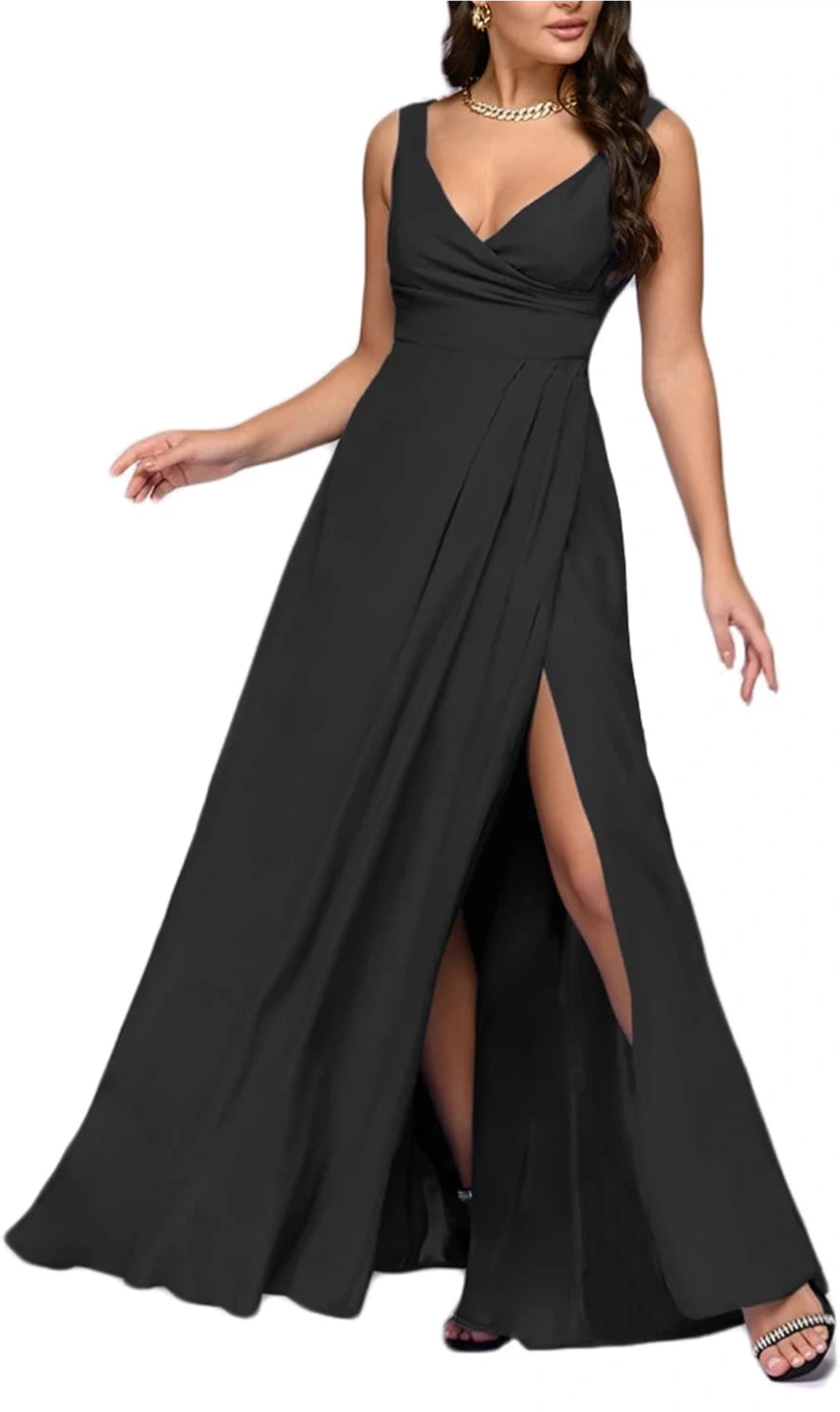 【Features】: side slit/v-neck/solid color/sleeveless/pleated/elegant/High Waist/A-line/evening gowns/bridesmaid dress/formal dresses/semi formal dress/cocktail dresses/maxi dress.