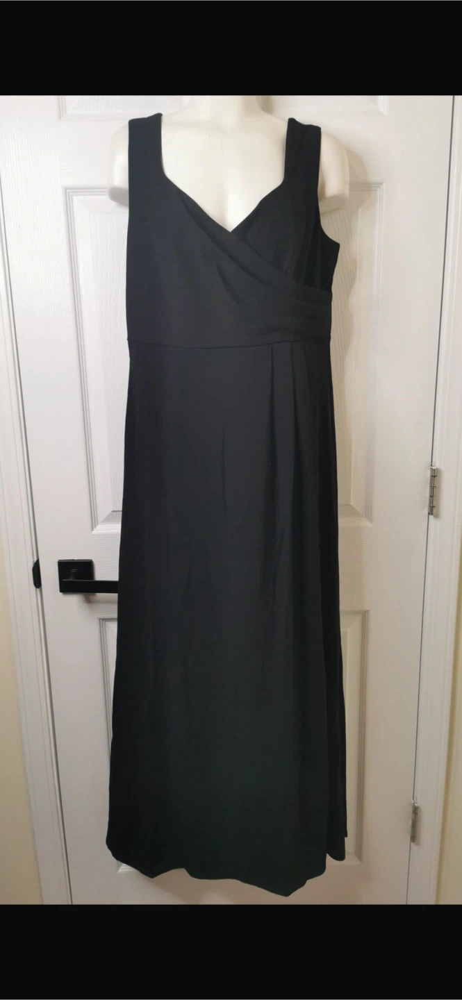 NEW! This black maxi dress features a flattering V-neckline and a stylish high slit. It's sleeveless with a ruched detail at the waist. Perfect for evening events!
