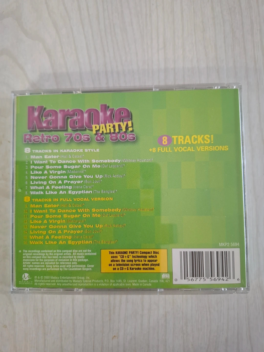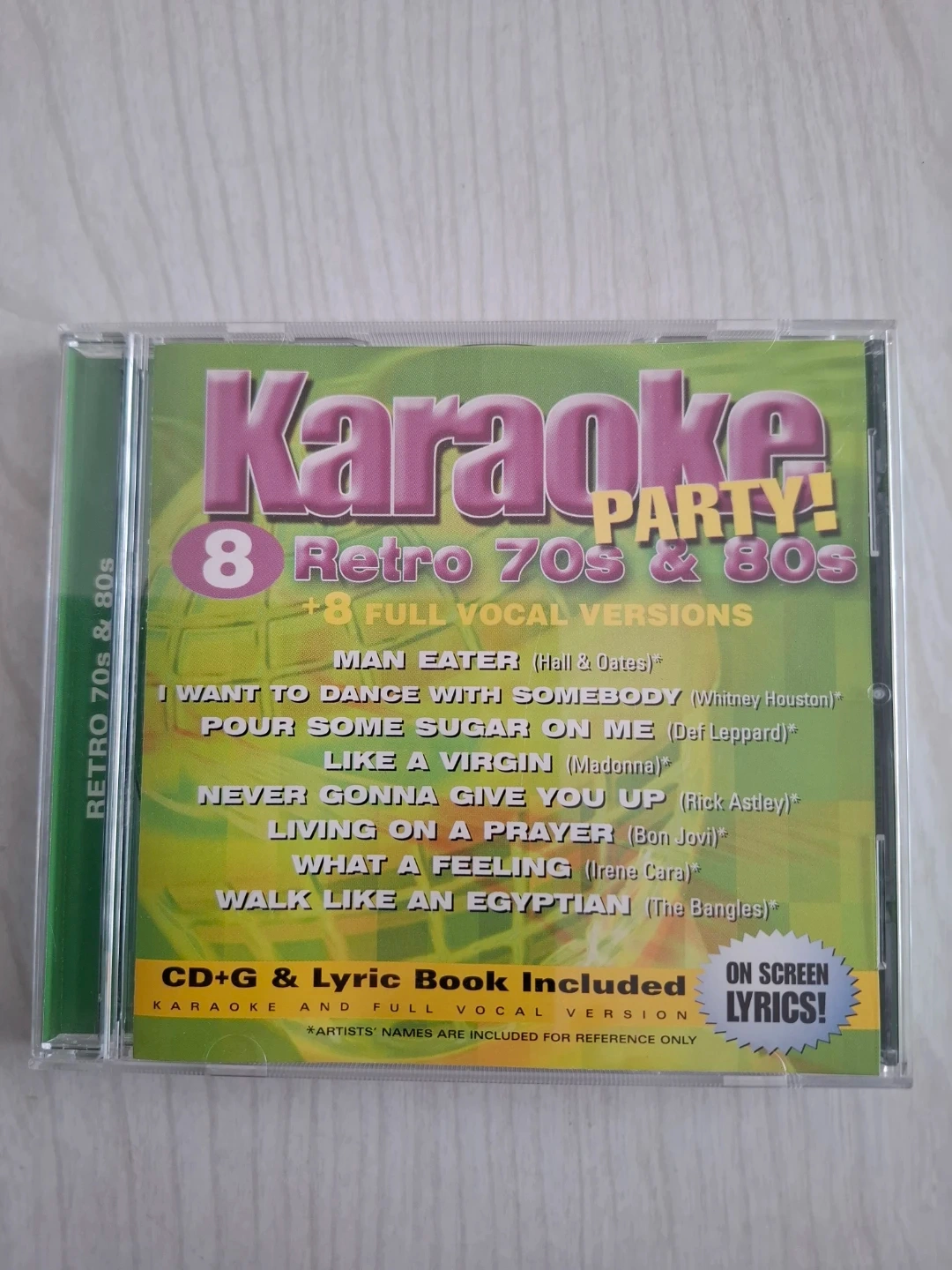 This is a Karaoke Party! CD+G disc featuring hits from the 70s and 80s. It includes 8 tracks in karaoke style and 8 full vocal versions. The CD+G format allows lyrics to display on a screen with a karaoke machine.